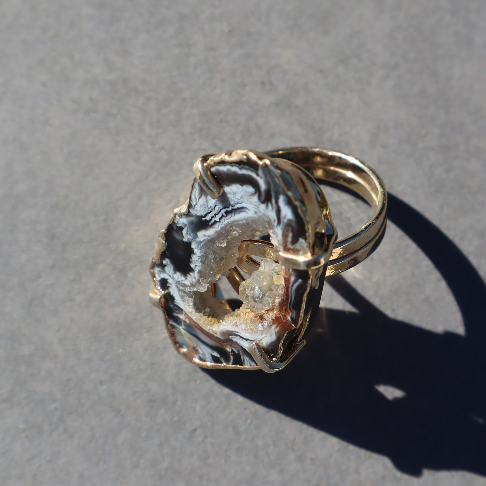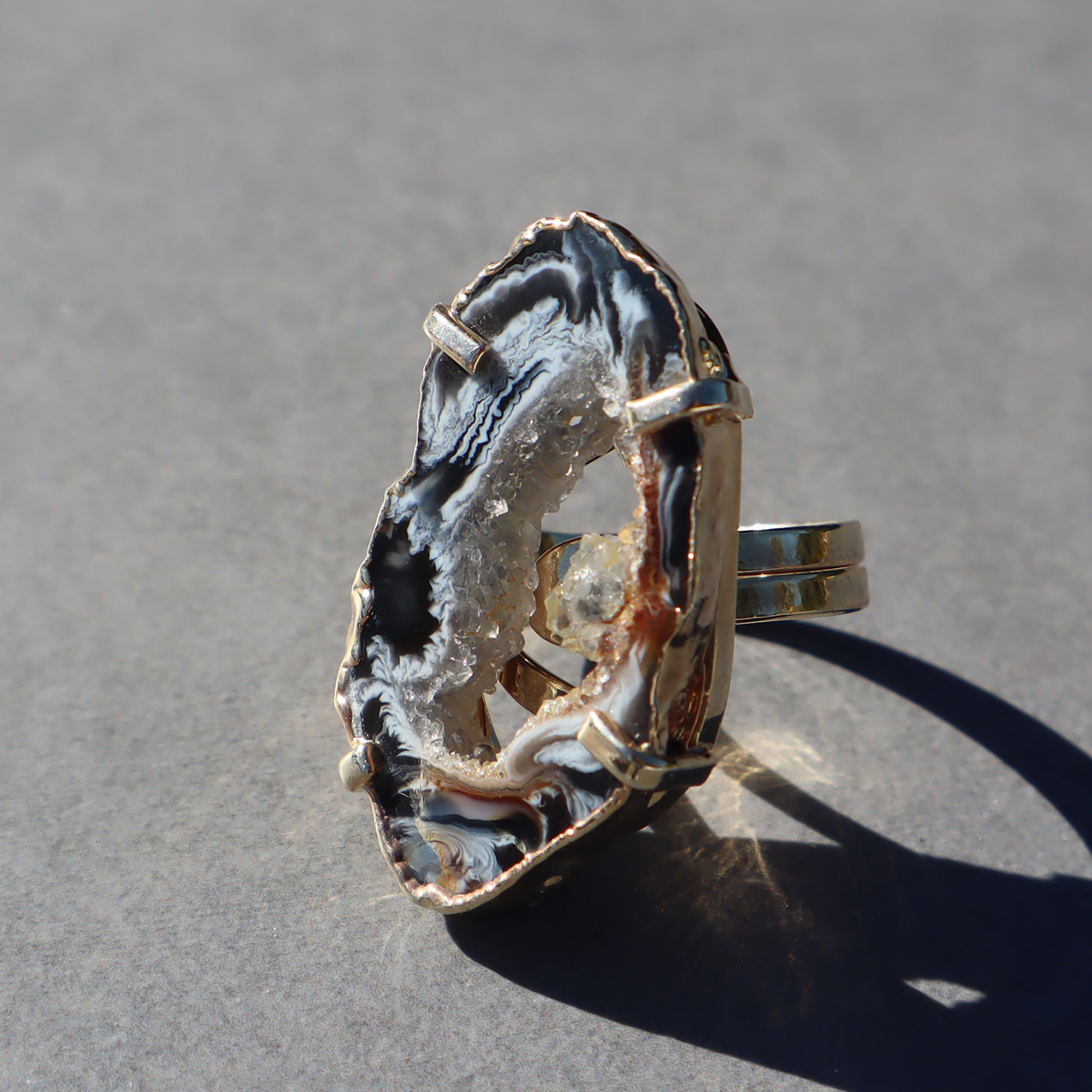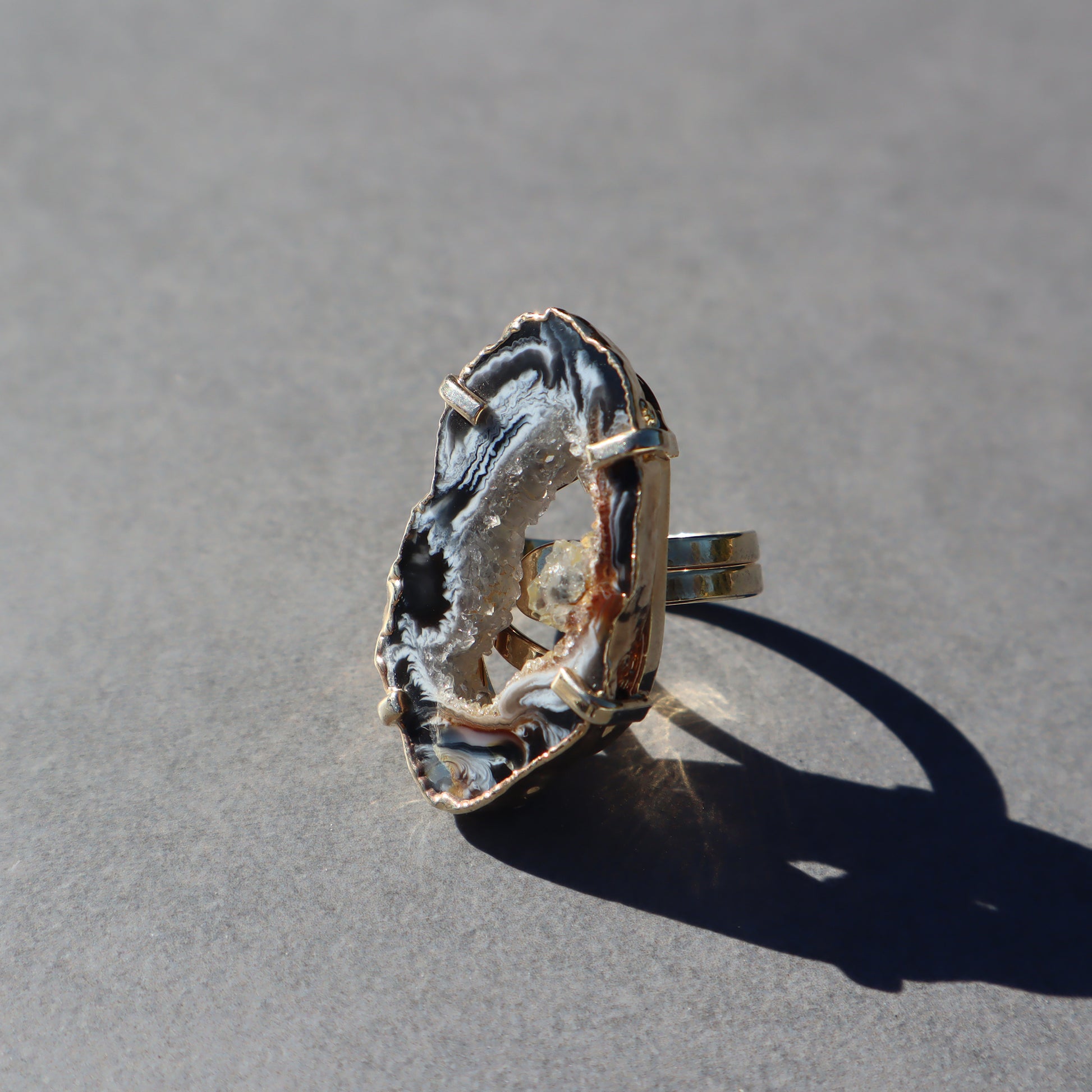 The exquisite handmade druzy crystal ring showcases stunning banded agate, infused with earnest tones and mesmerizing patterns that capture the light with every movement. Sparkling druzy crystals are presented as the centerpiece and are a natural geode slice that radiates a sense of organic elegance.