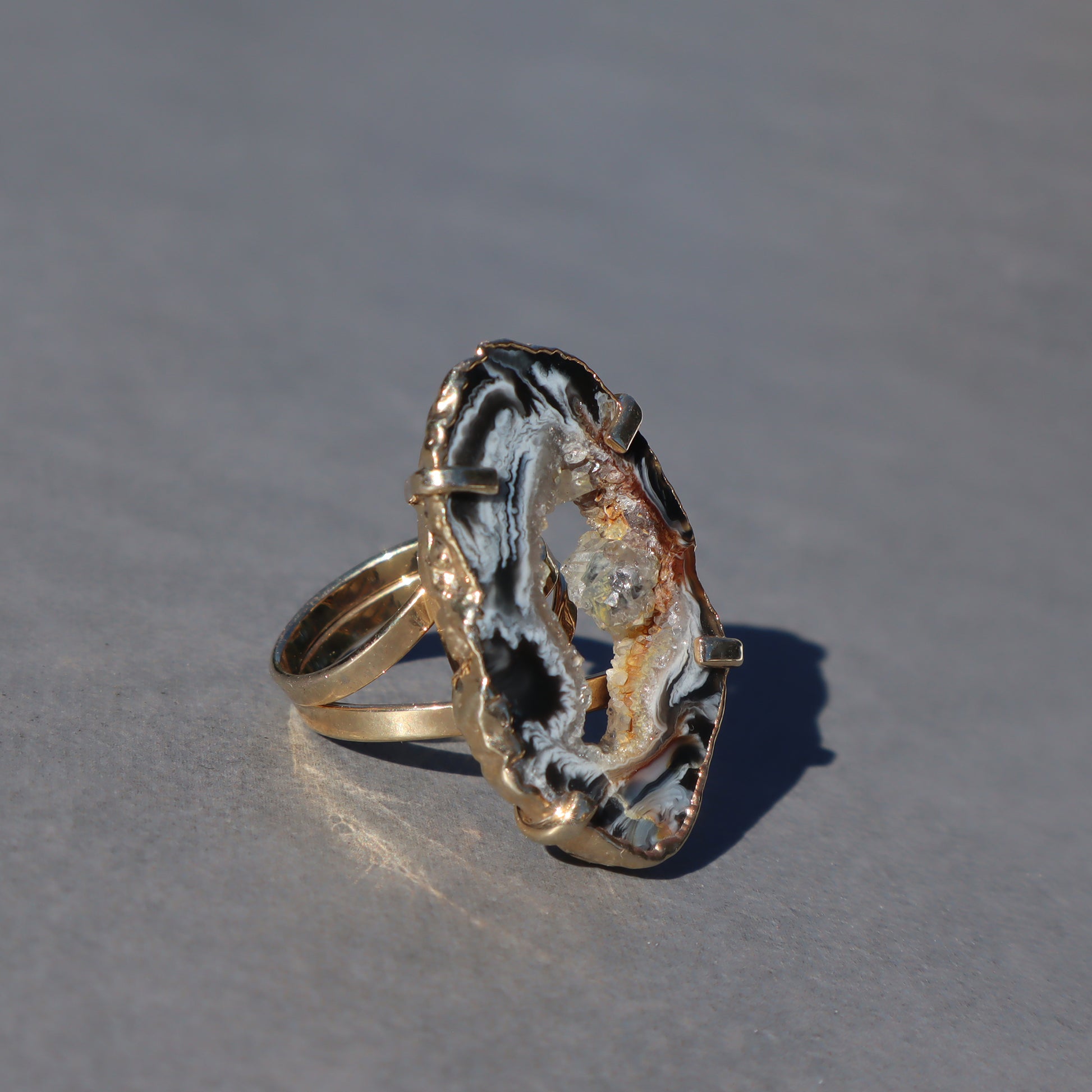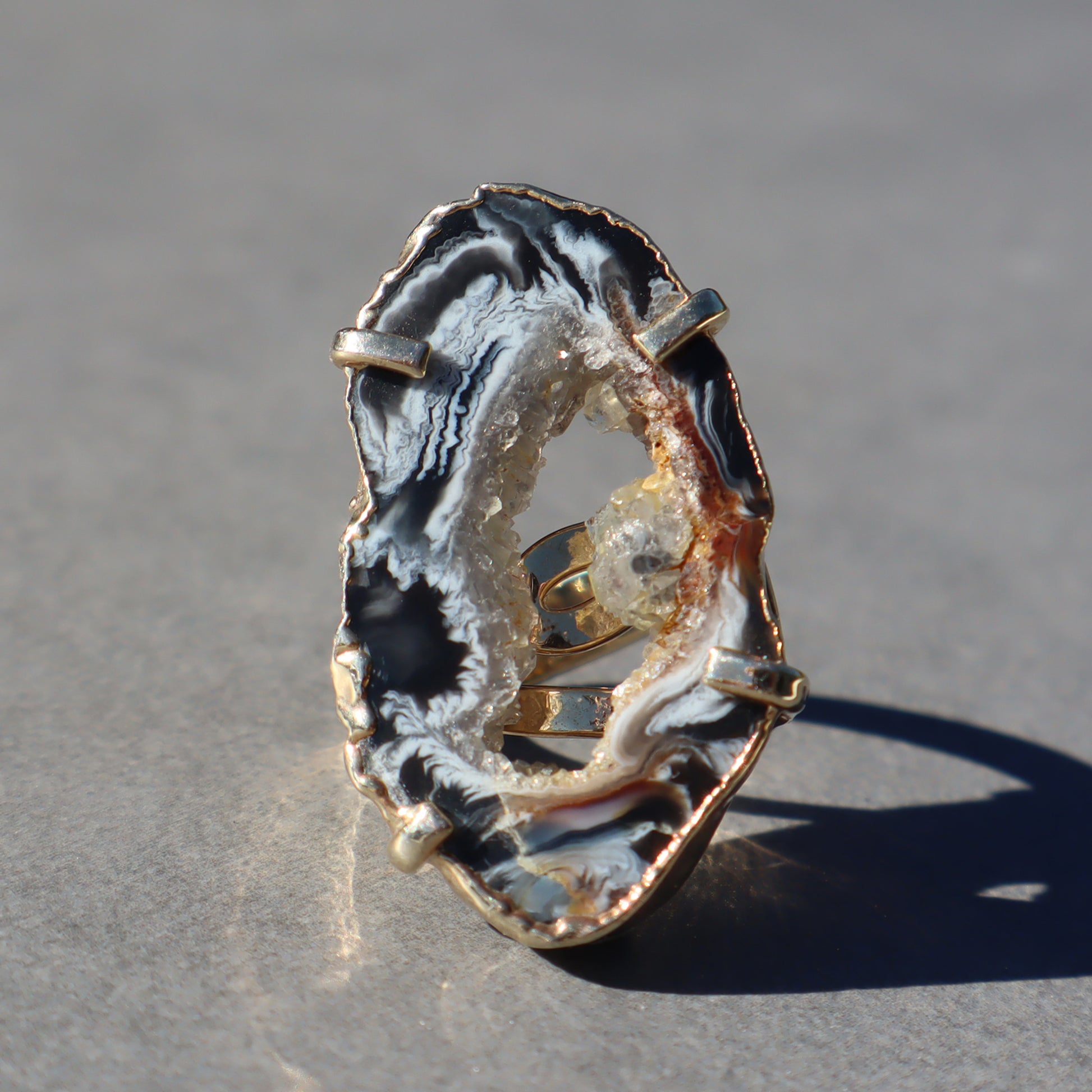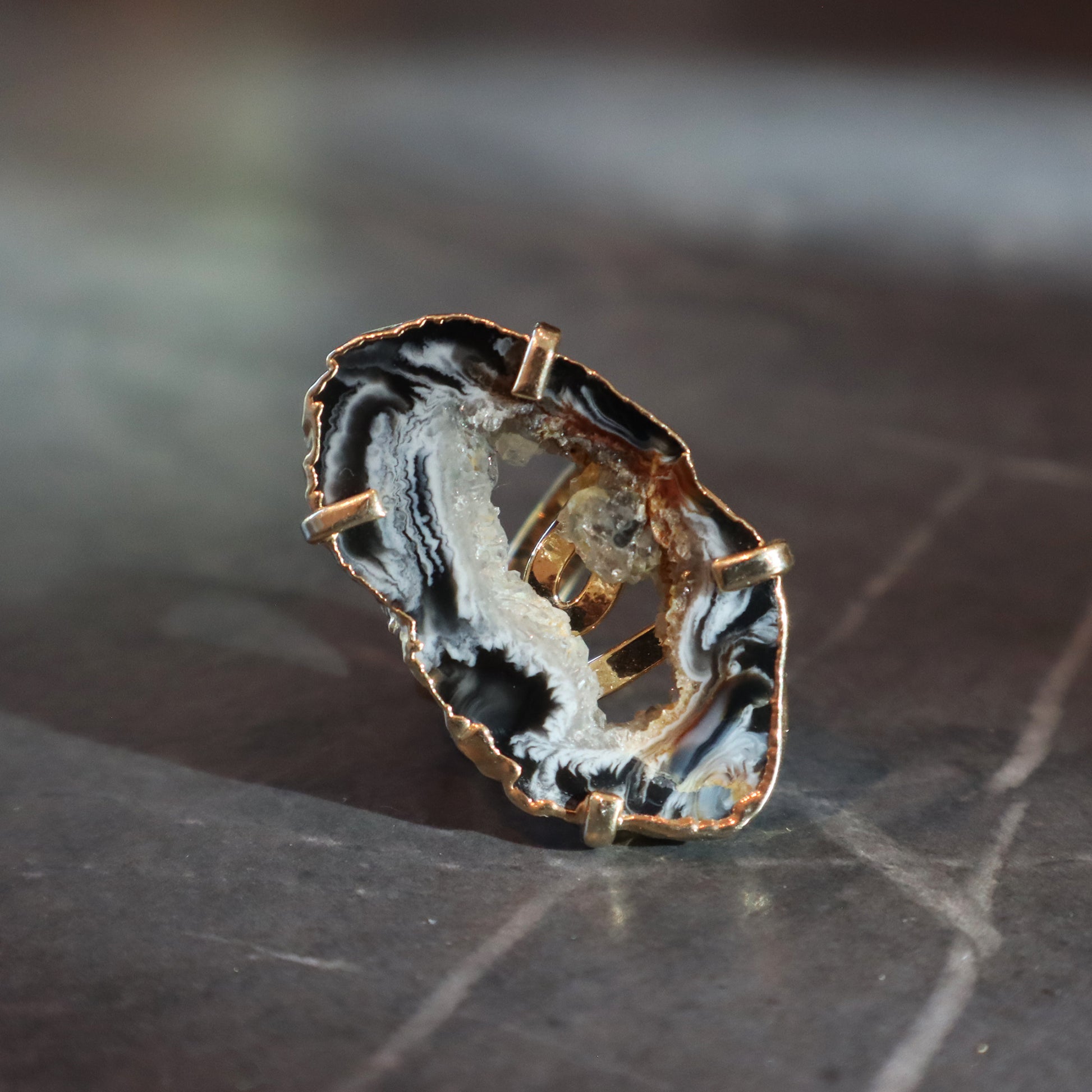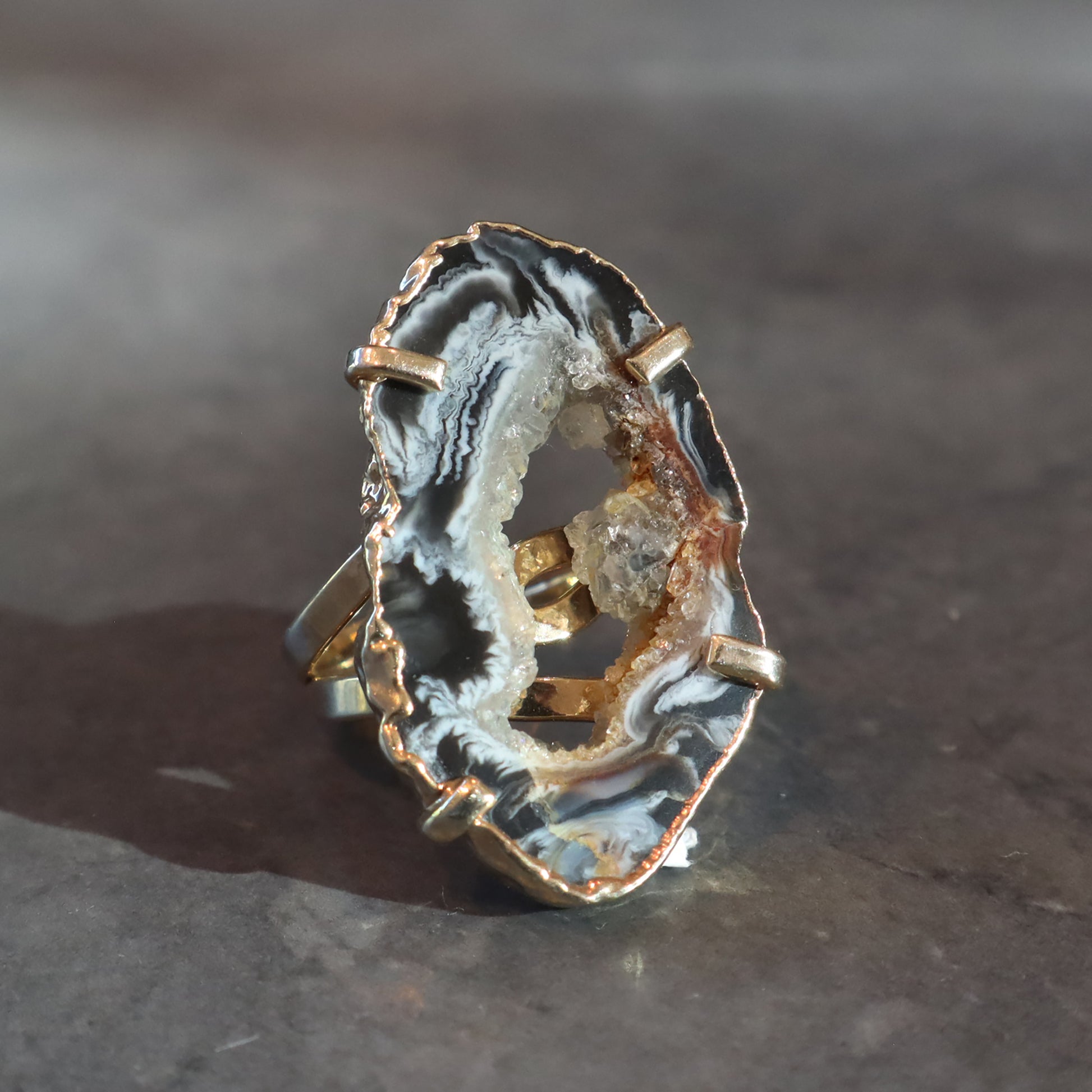 The exquisite handmade druzy crystal ring showcases stunning banded agate, infused with earnest tones and mesmerizing patterns that capture the light with every movement. Sparkling druzy crystals are presented as the centerpiece and are a natural geode slice that radiates a sense of organic elegance.