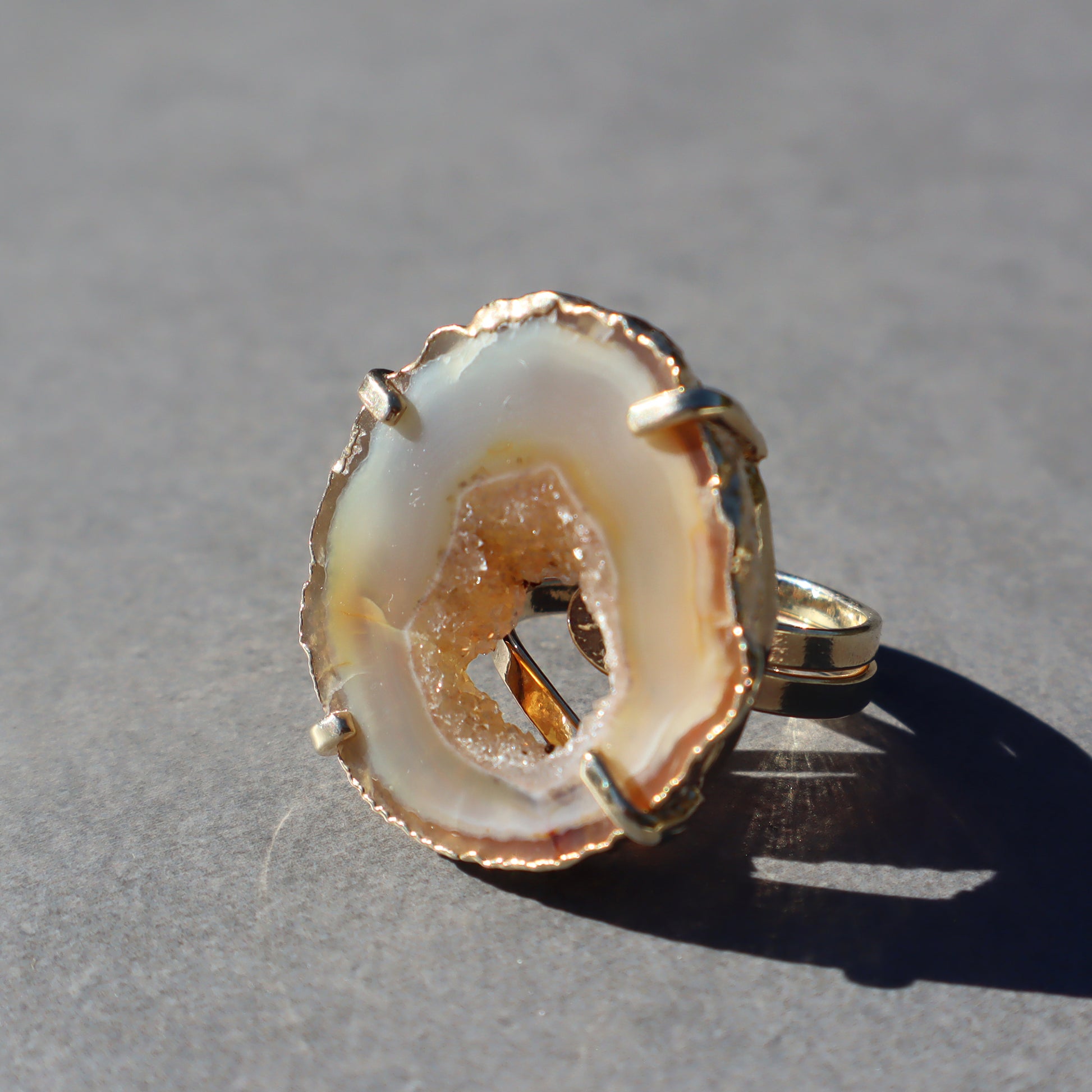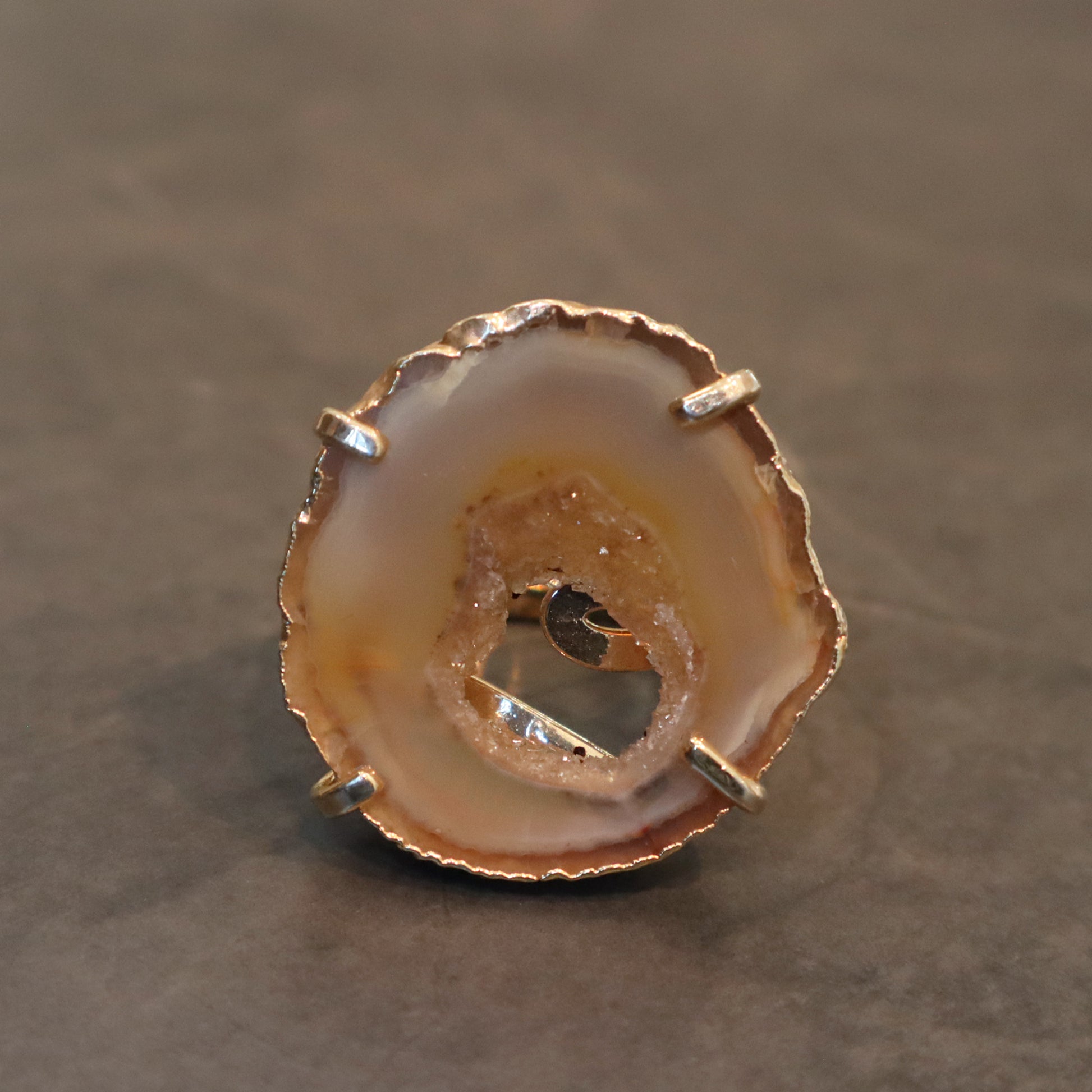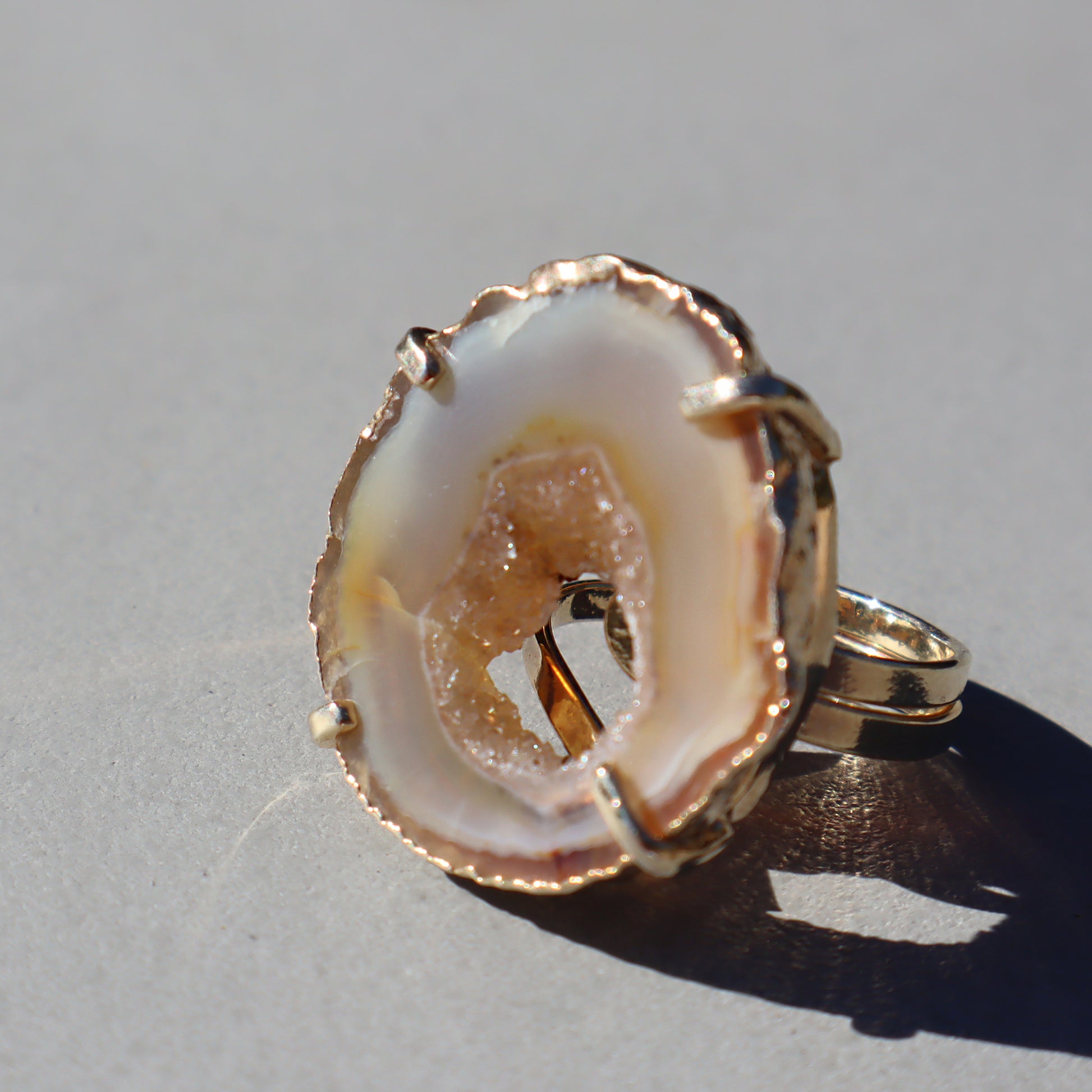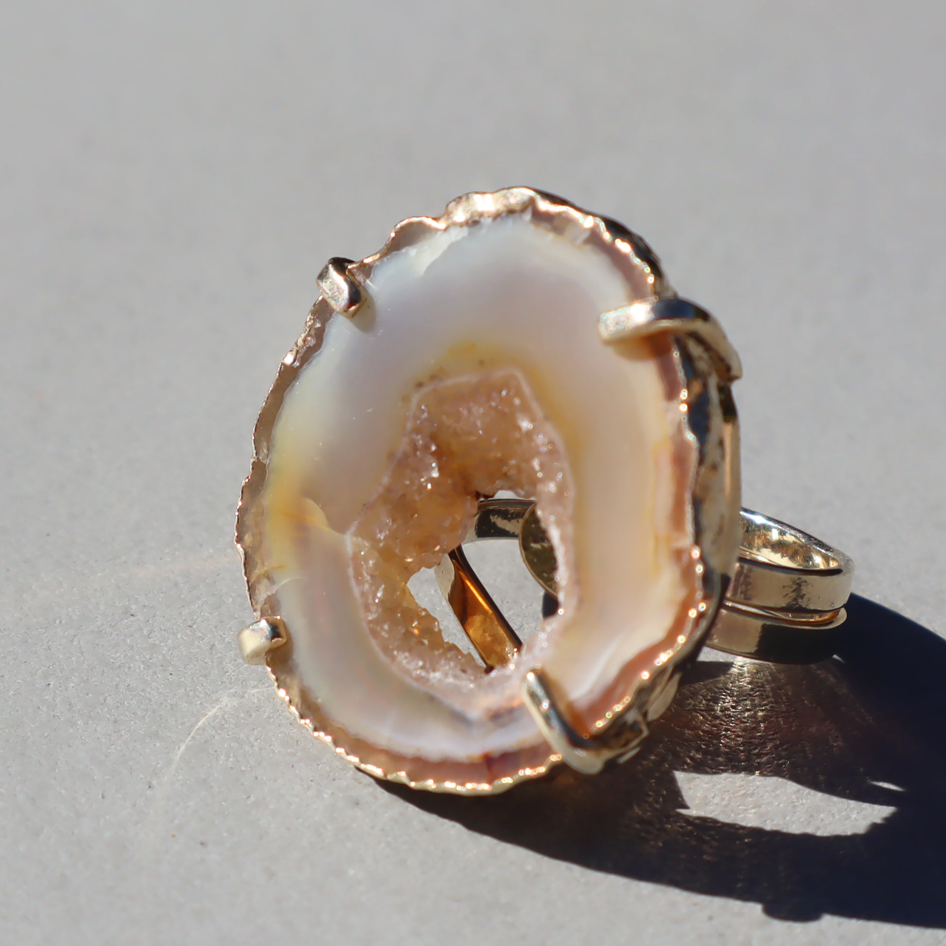 This handcrafted beauty showcases the natural charm of a light agate and druzy ring. The centerpiece of this exquisite ring features a delicate slice of light agate, its translucent layers revealing soft, ethereal hues of undeniable luxury. Nestled alongside the agate is a sparkling druzy formation, its surface adorned with tiny, glittering crystals that add a touch of celestial magic to the piece.
