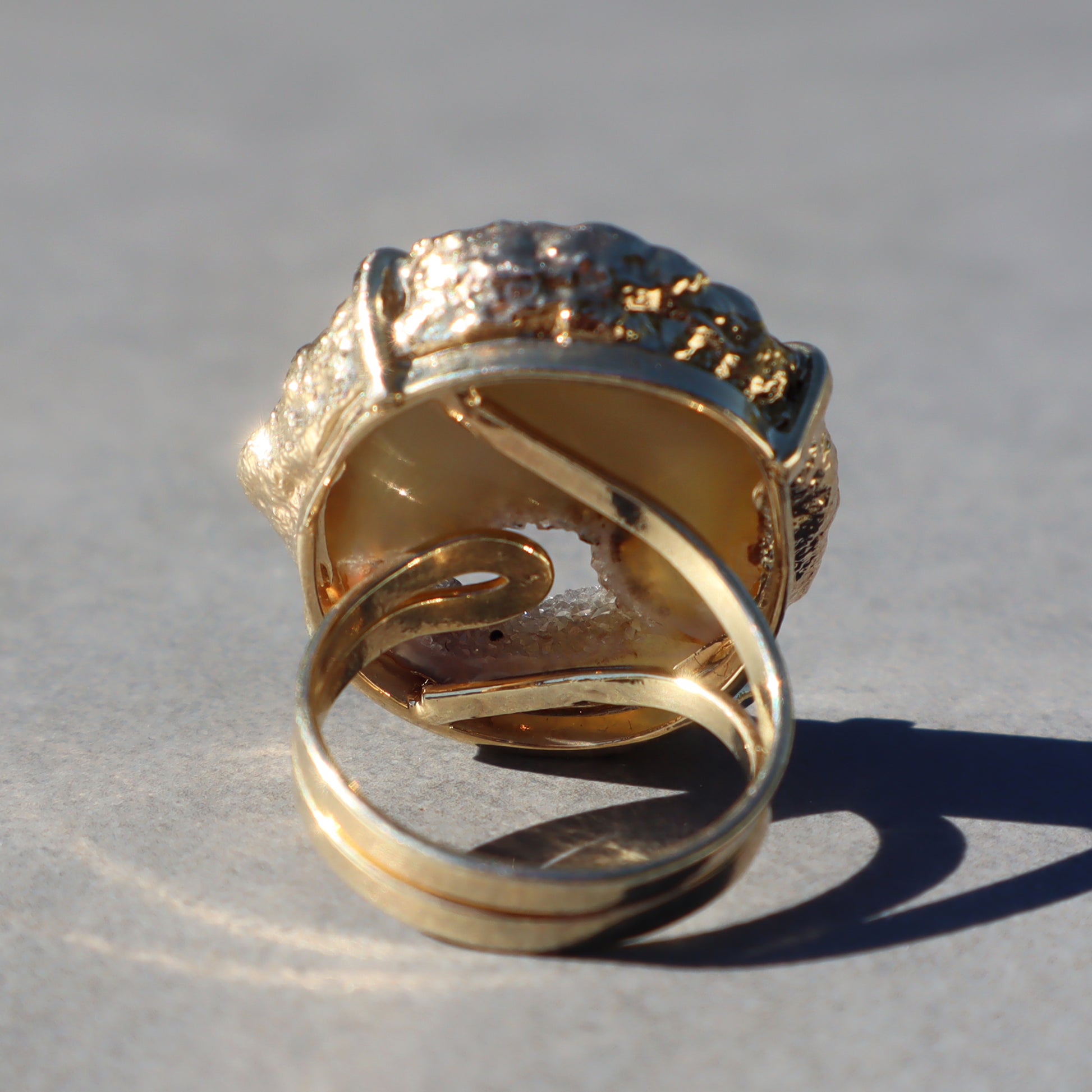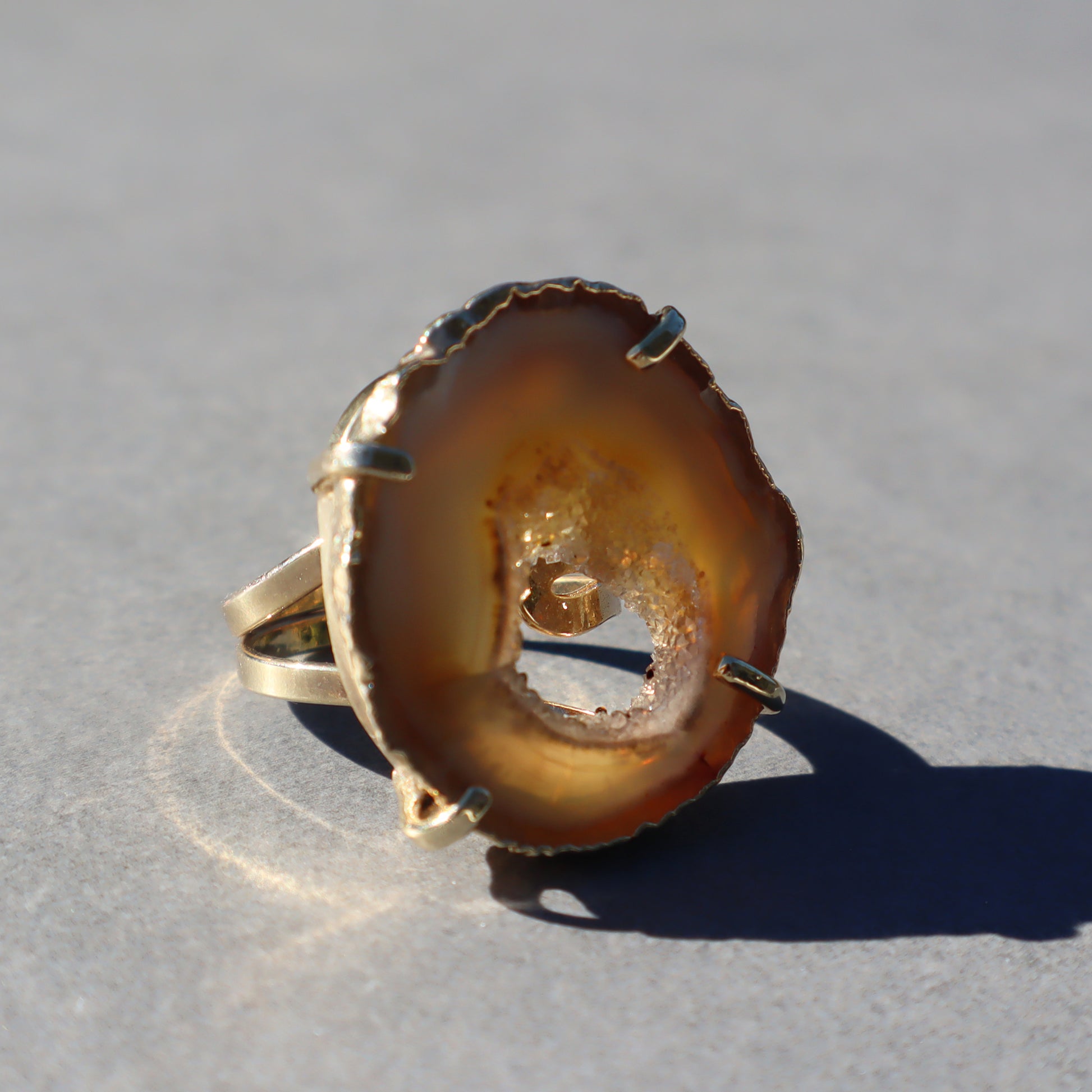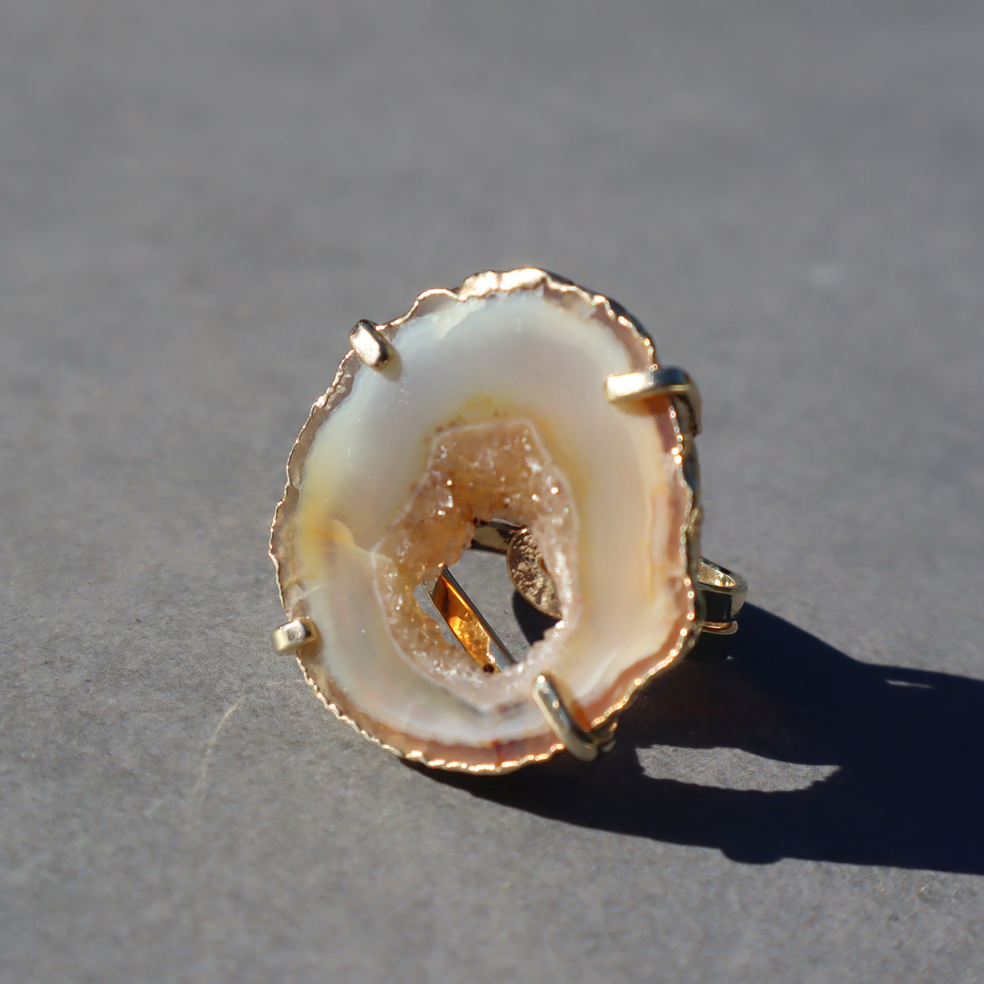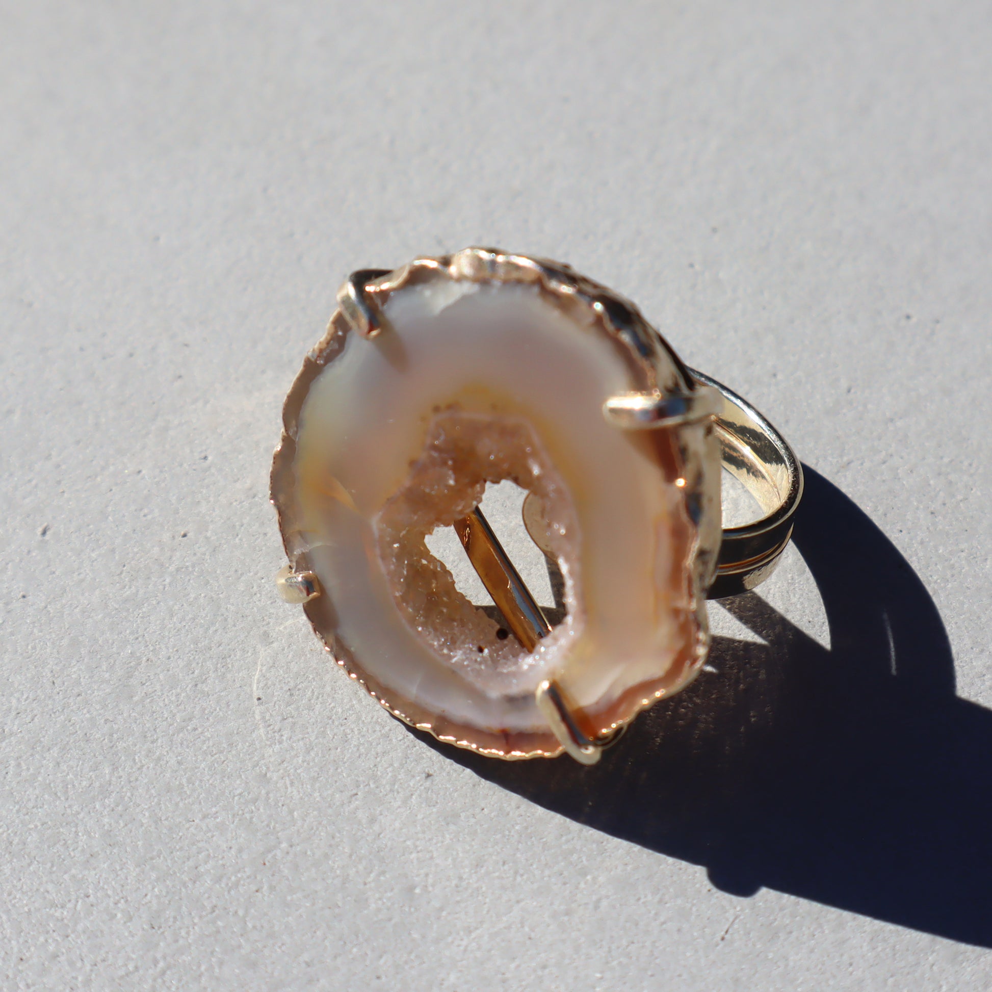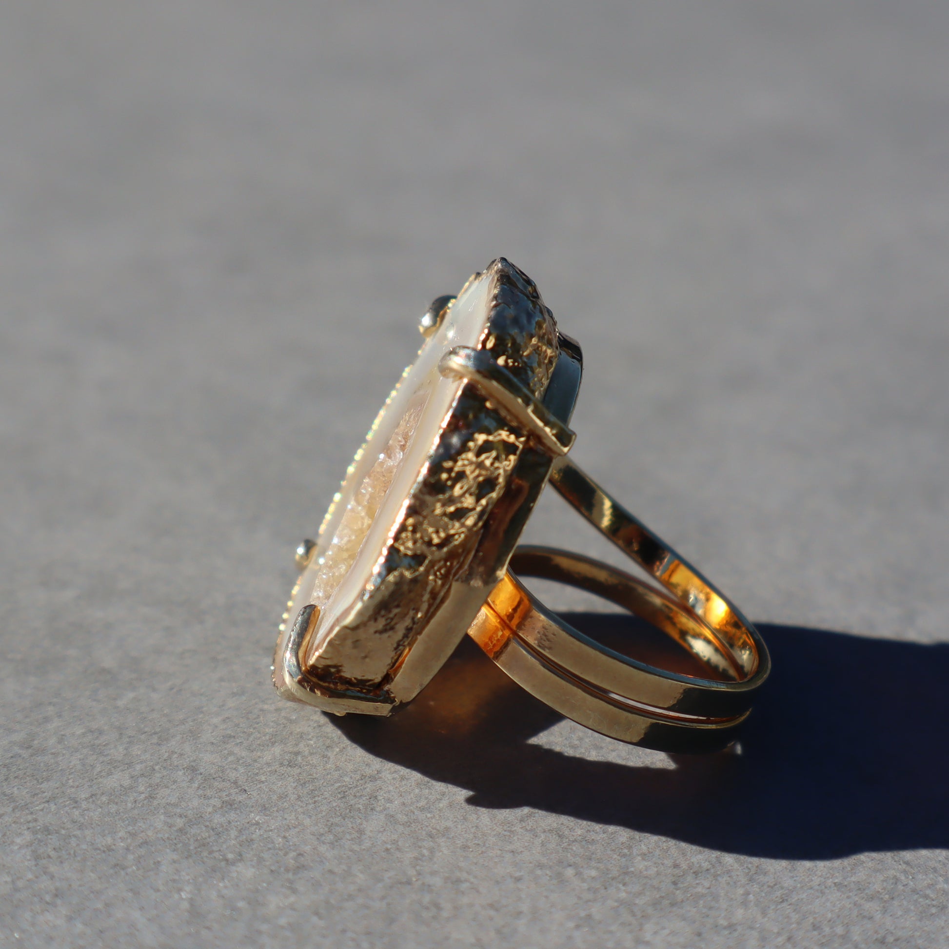 This handcrafted beauty showcases the natural charm of a light agate and druzy ring. The centerpiece of this exquisite ring features a delicate slice of light agate, its translucent layers revealing soft, ethereal hues of undeniable luxury. Nestled alongside the agate is a sparkling druzy formation, its surface adorned with tiny, glittering crystals that add a touch of celestial magic to the piece.