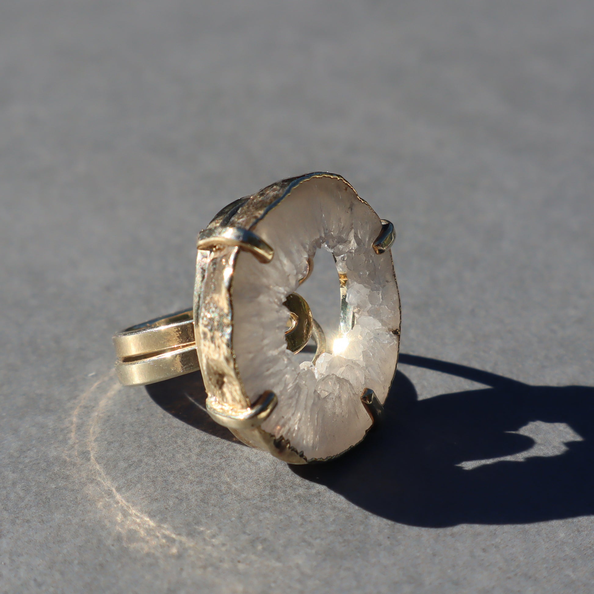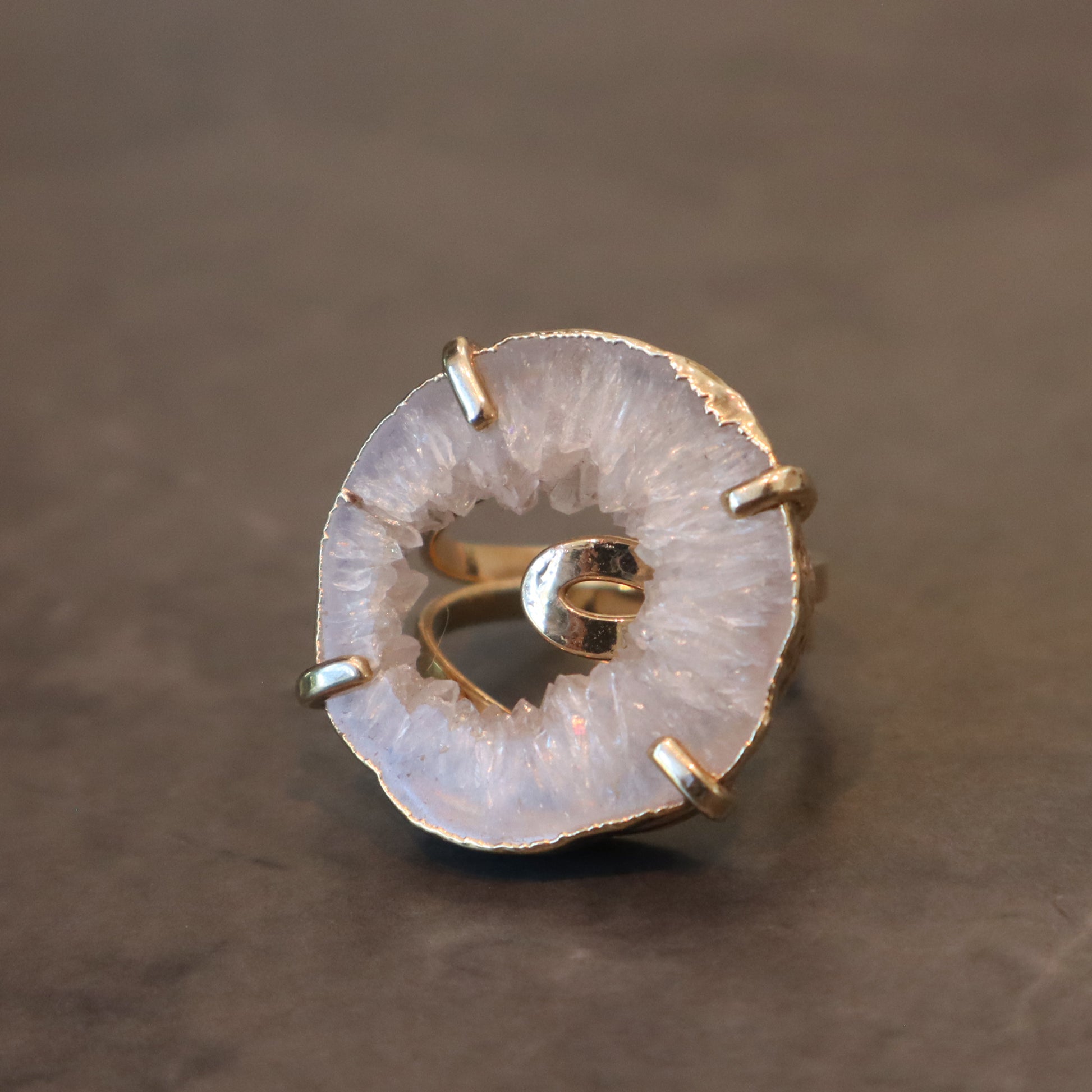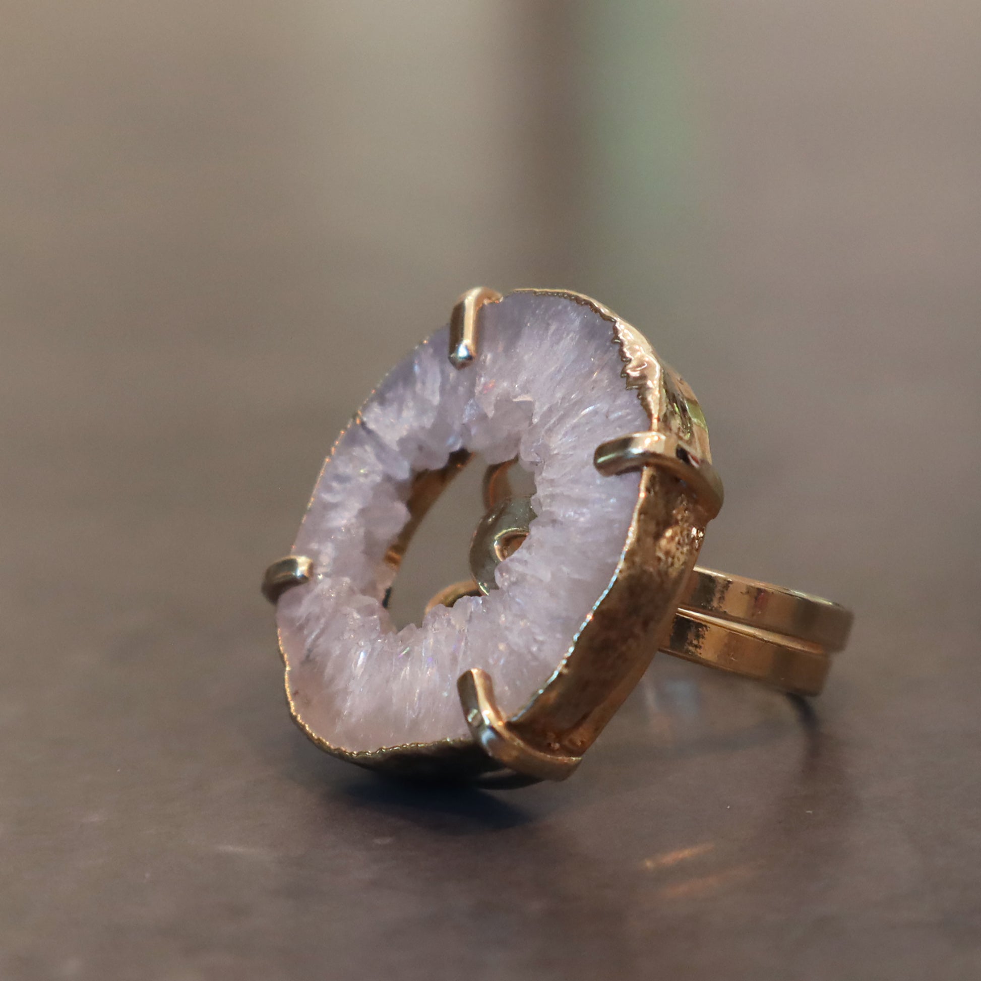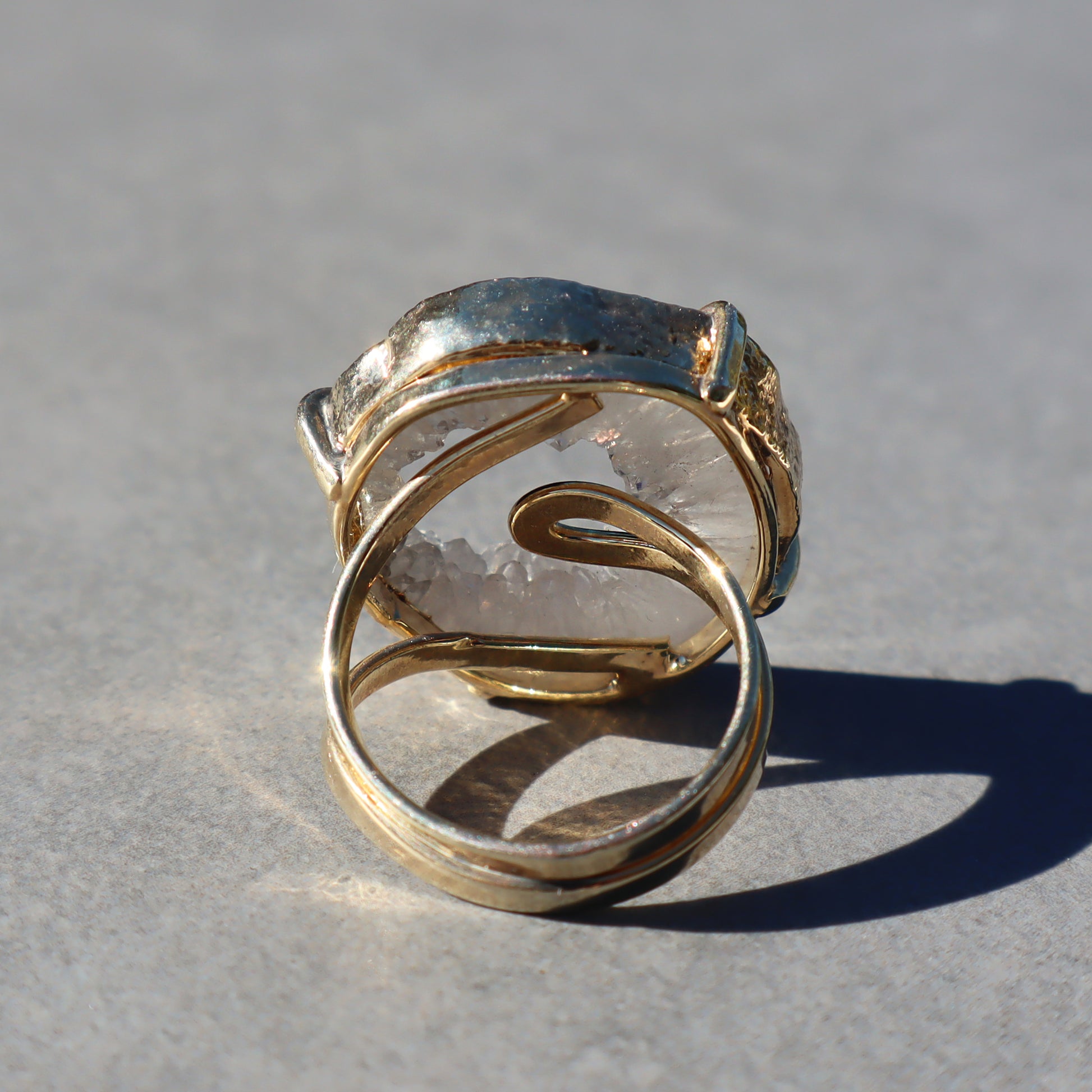 Supporting this crystalline wonder is a beautifully handcrafted, adjustable gold-plated band, while its accommodating nature ensures a perfect fit for any finger. The mineral aspect of this piece guarantees it to be a wearable work of art that combines the timeless allure of quartz crystal with the versatility and elegance of its gold-plated setting.