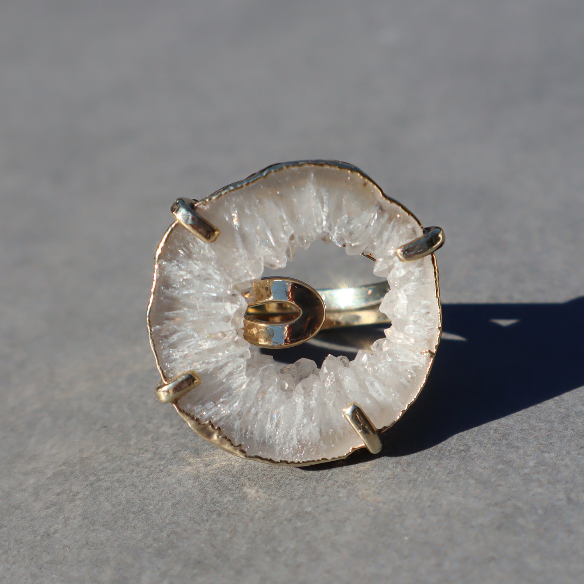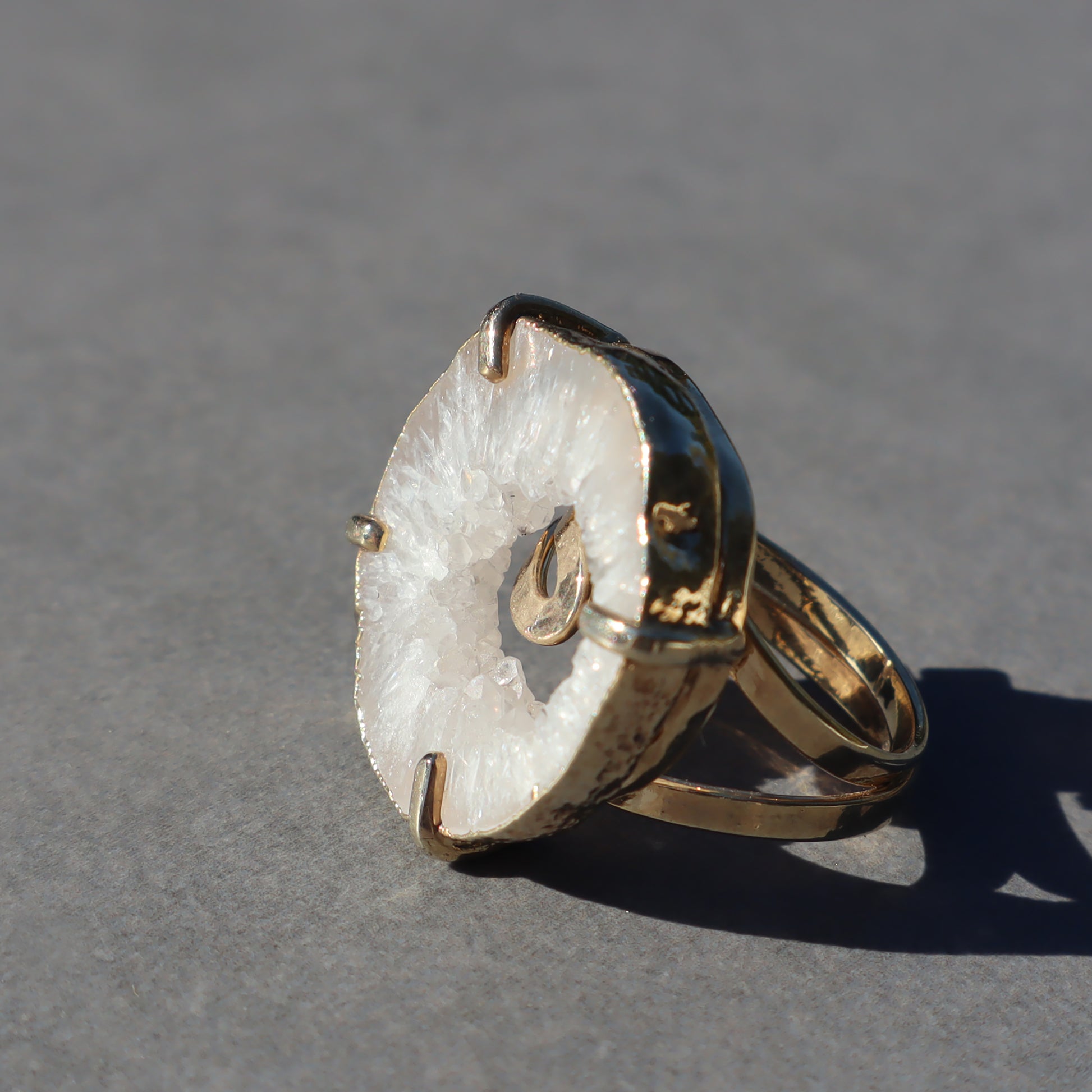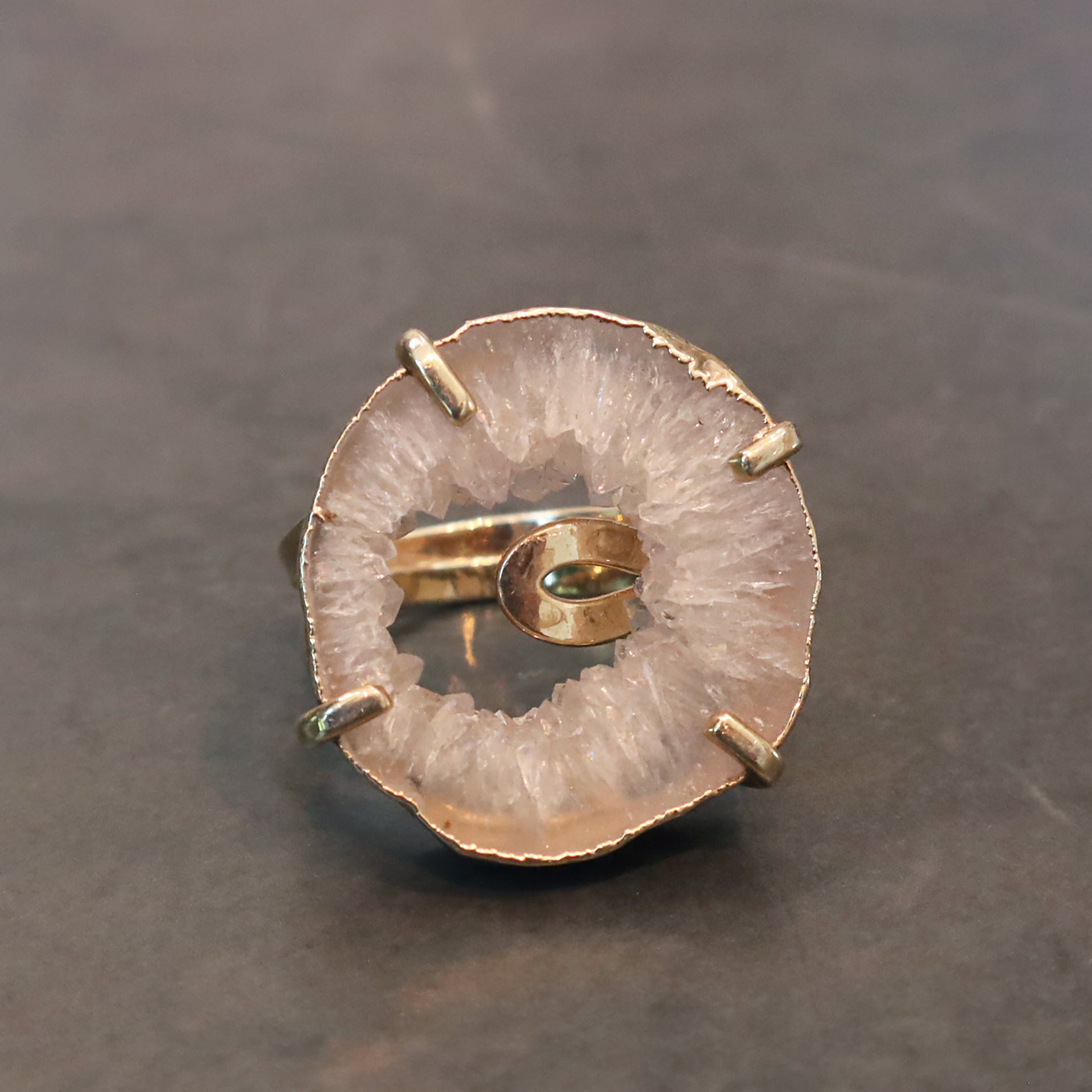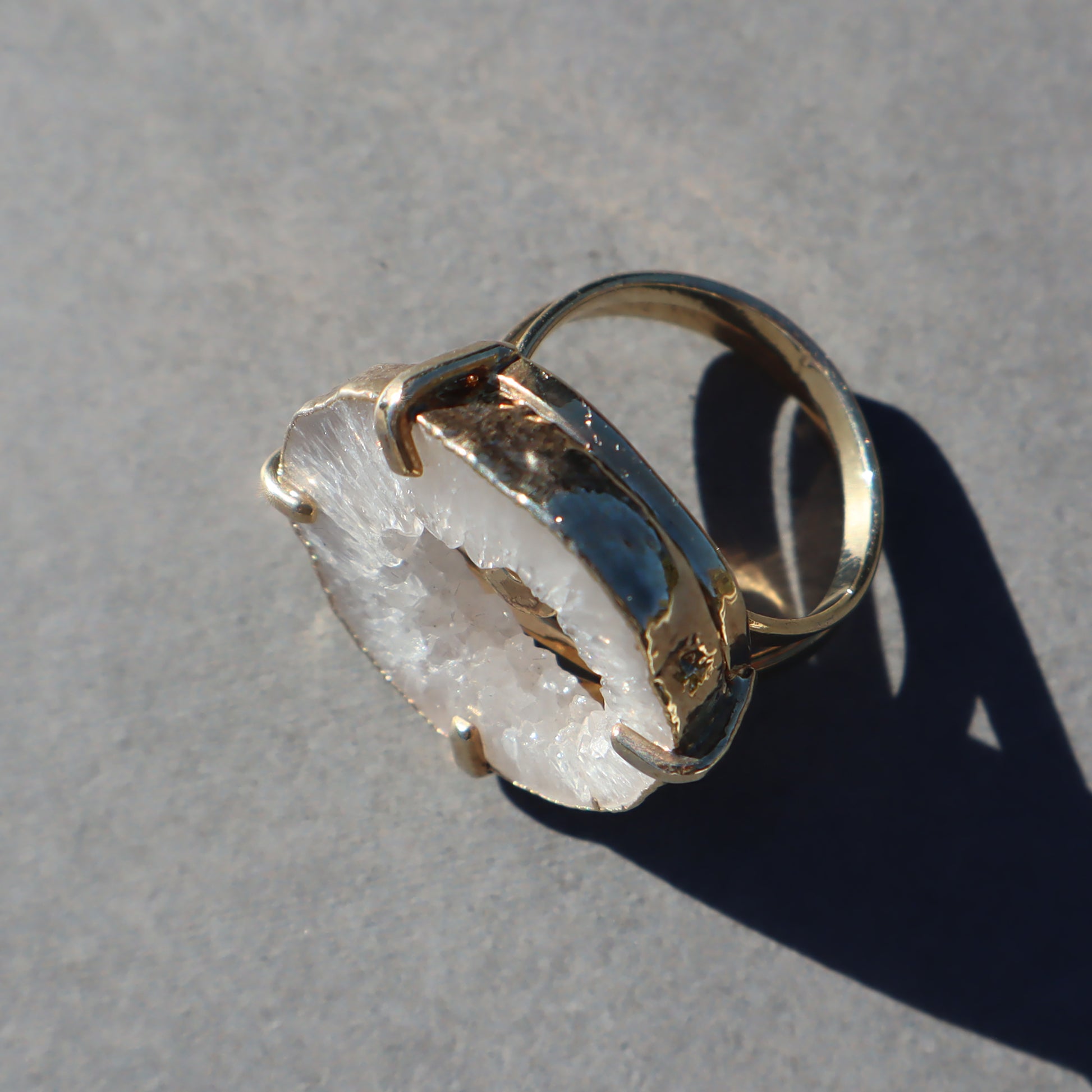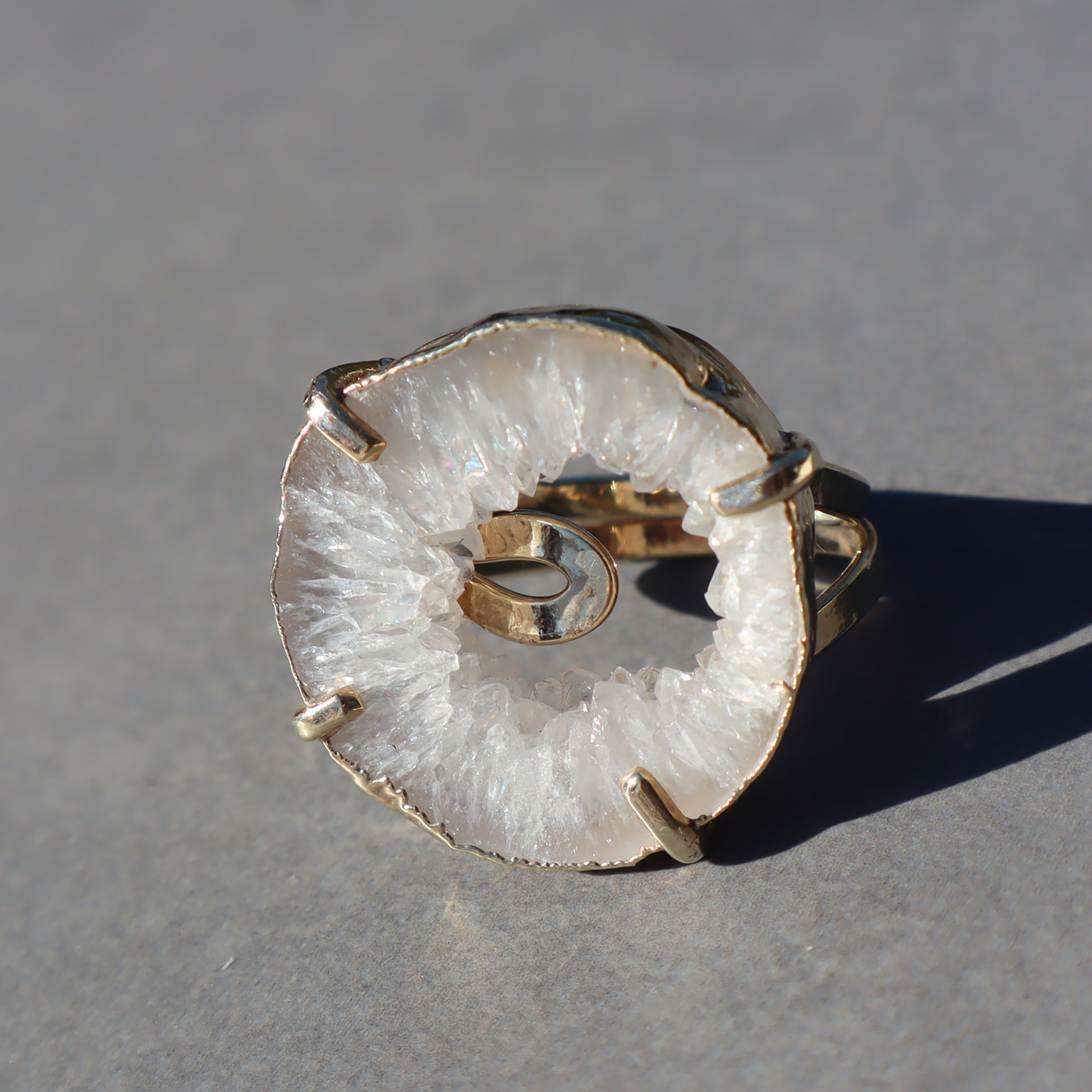Supporting this crystalline wonder is a beautifully handcrafted, adjustable gold-plated band, while its accommodating nature ensures a perfect fit for any finger. The mineral aspect of this piece guarantees it to be a wearable work of art that combines the timeless allure of quartz crystal with the versatility and elegance of its gold-plated setting.