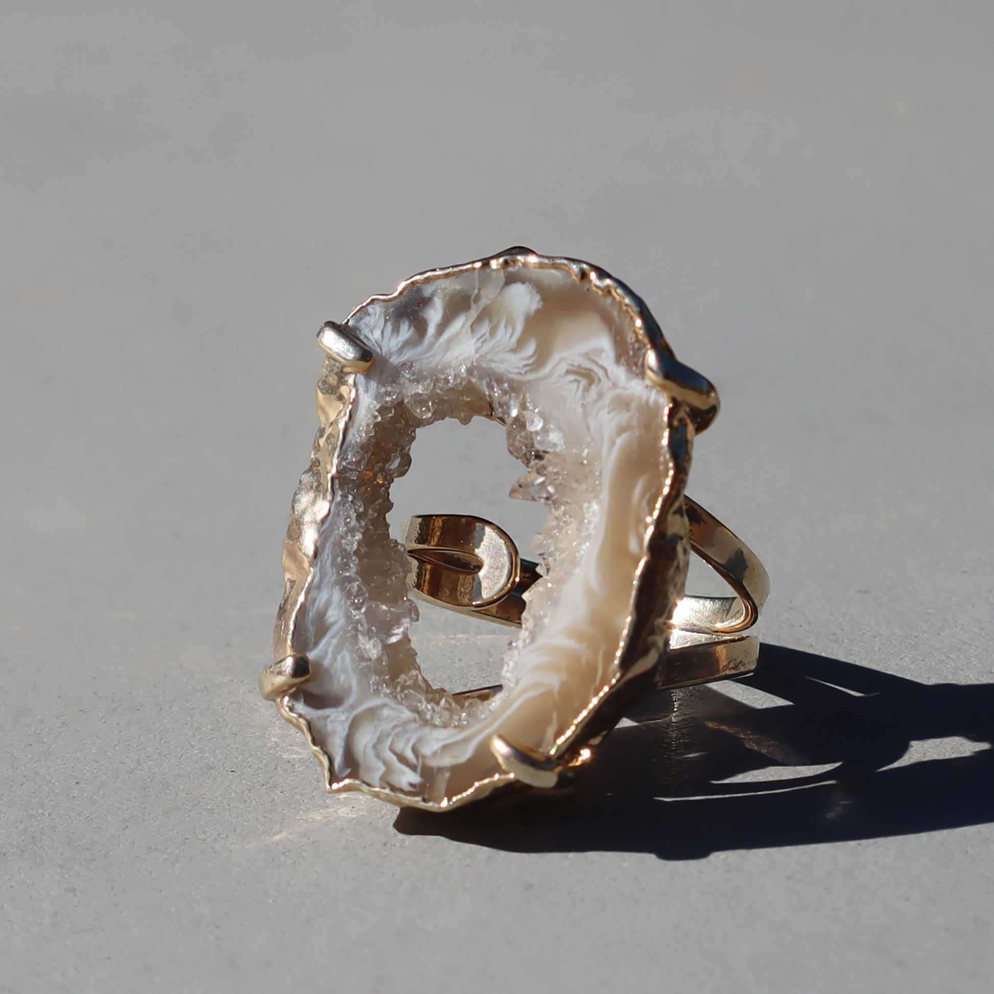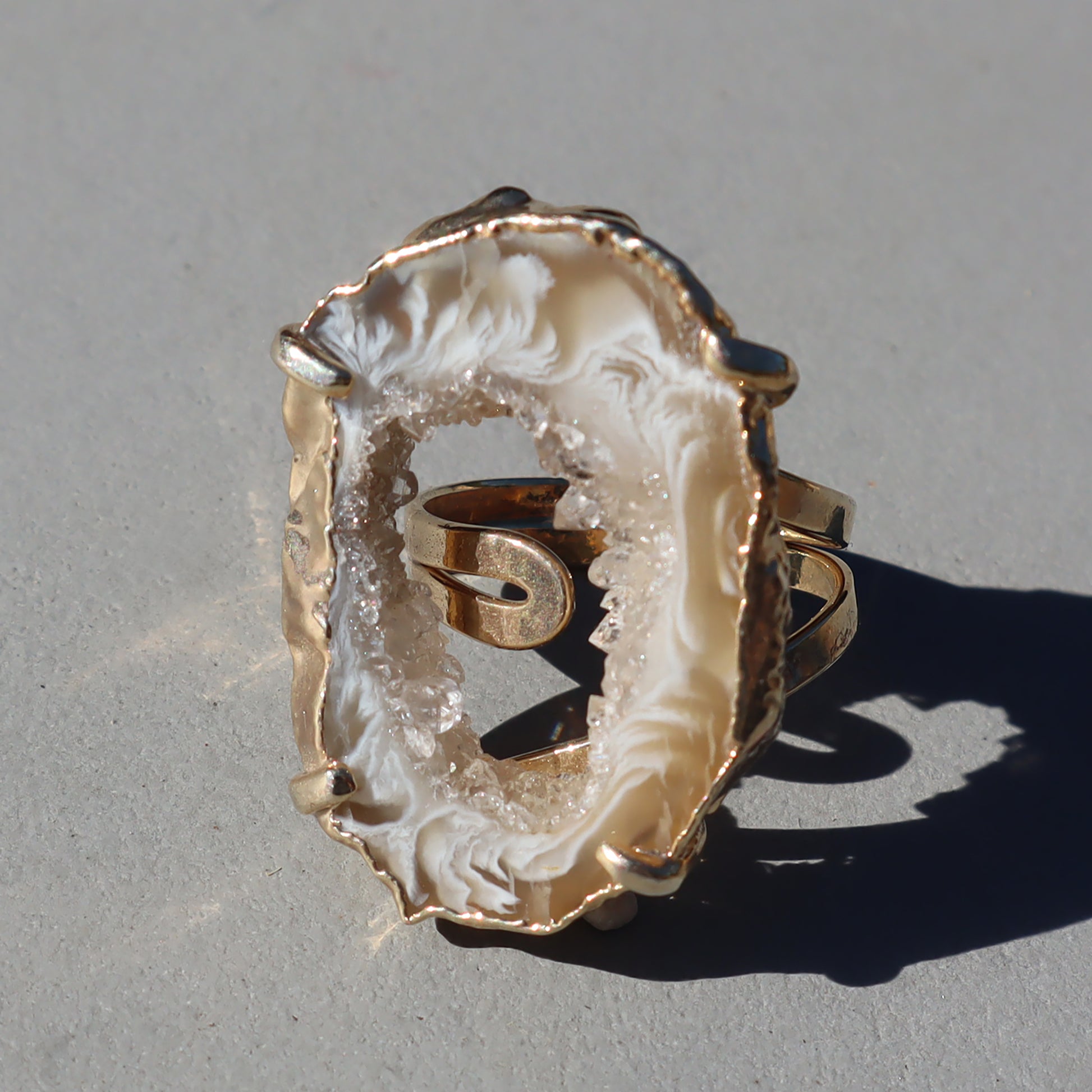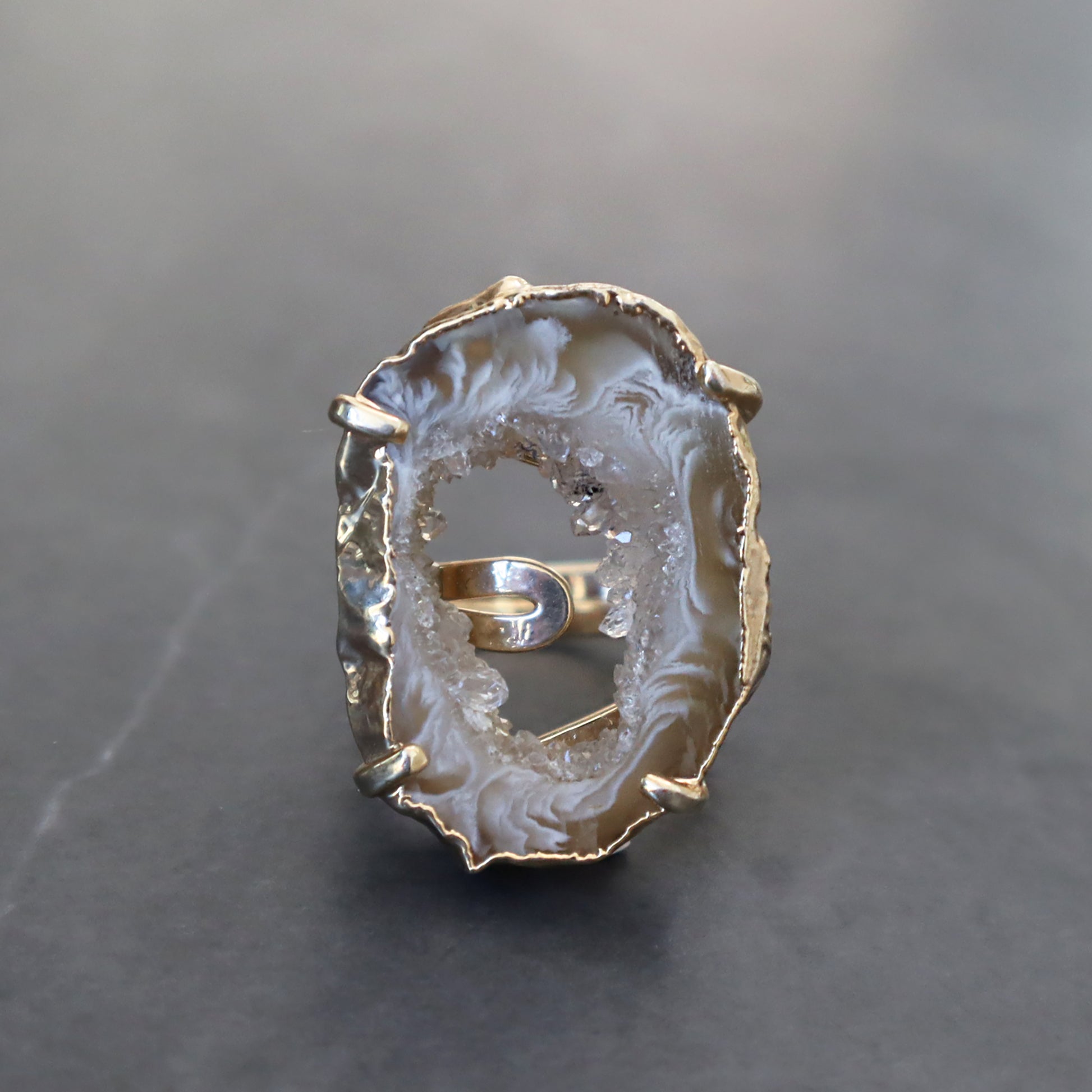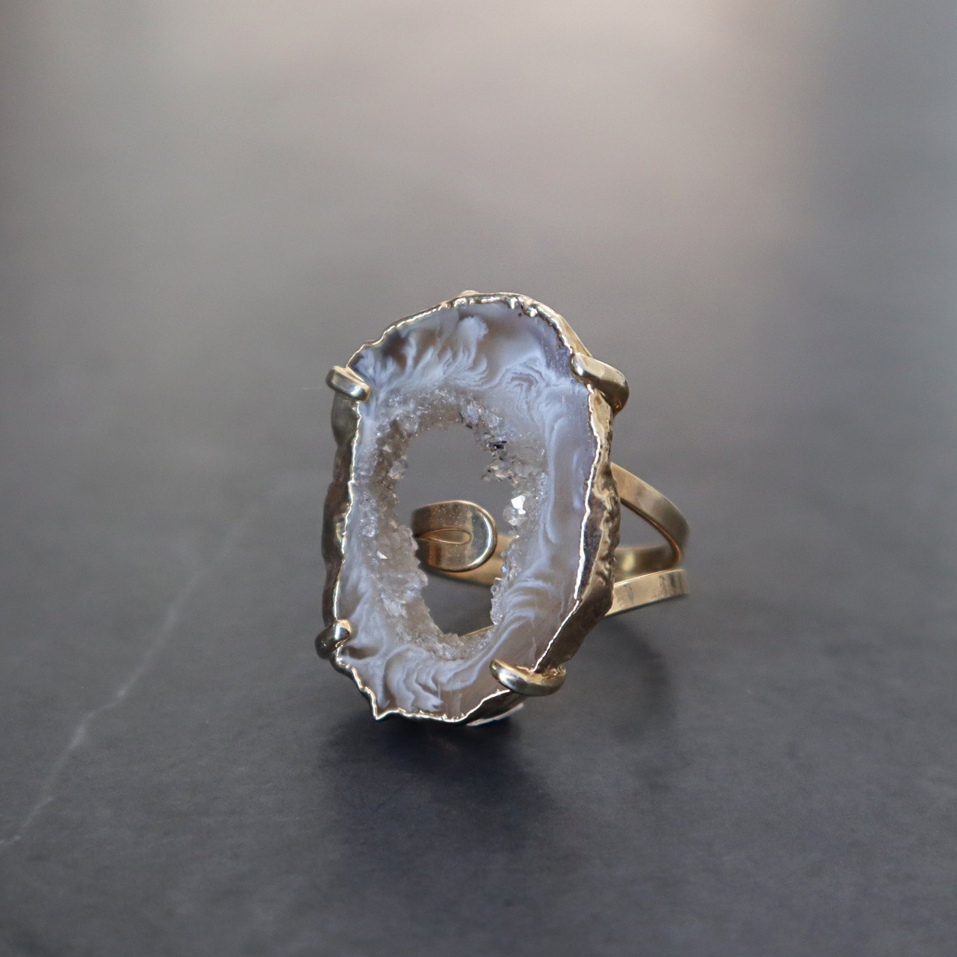 The handcrafted beauty of light agate and druzy crystal ring connects sophistication with raw beauty. Nestled alongside the agate is a sparkling formation of light-reflecting microcrystals that add a touch of celestial magic to the piece.
