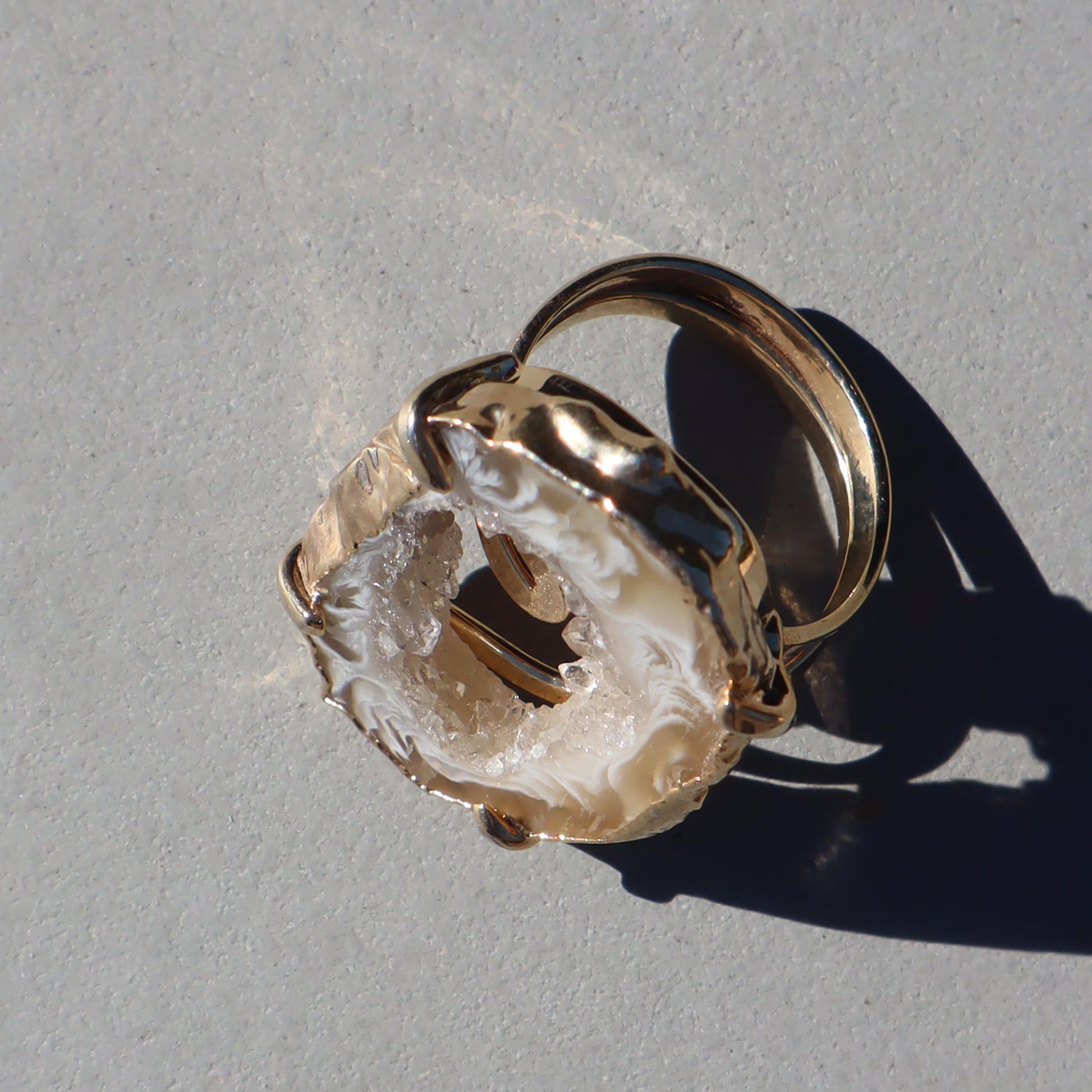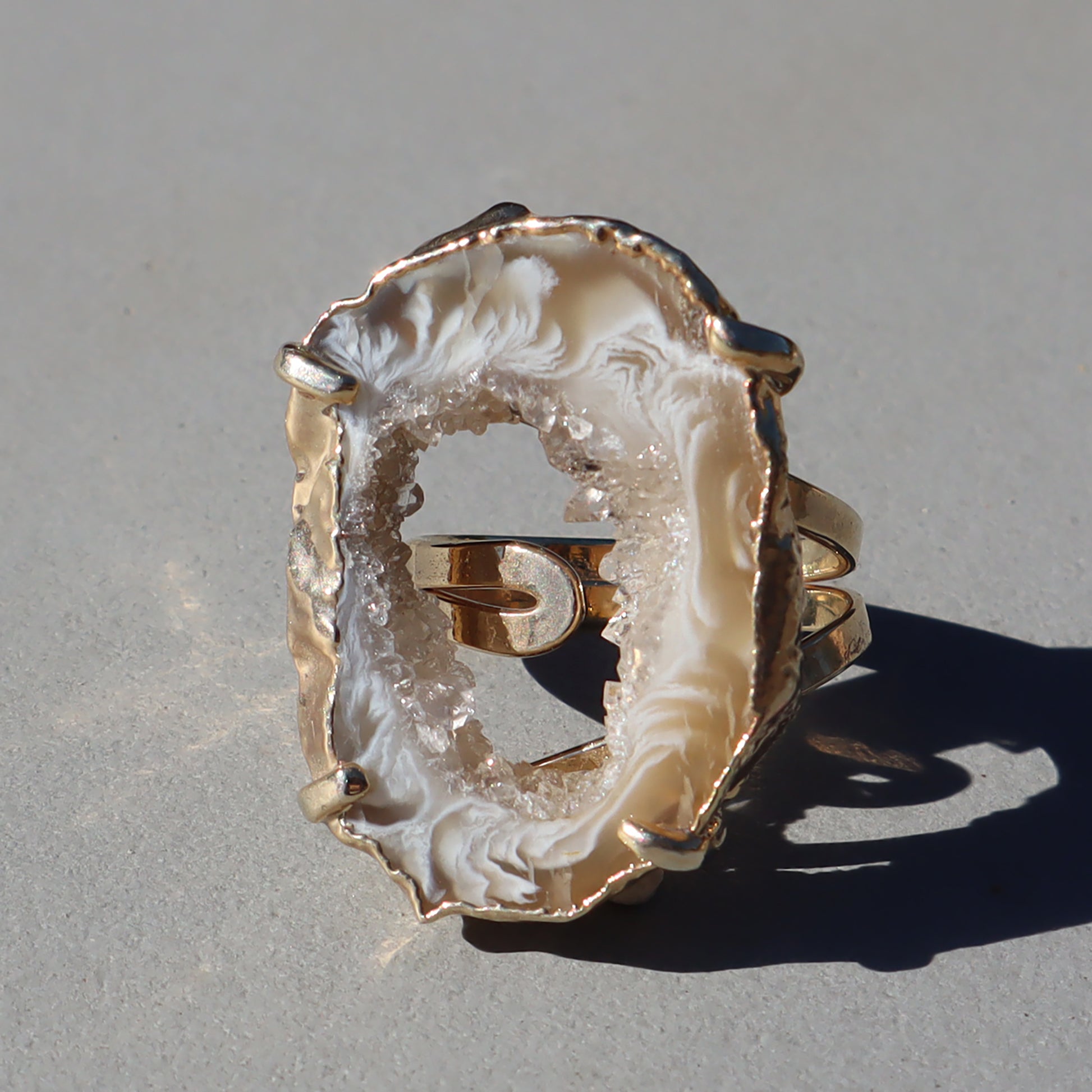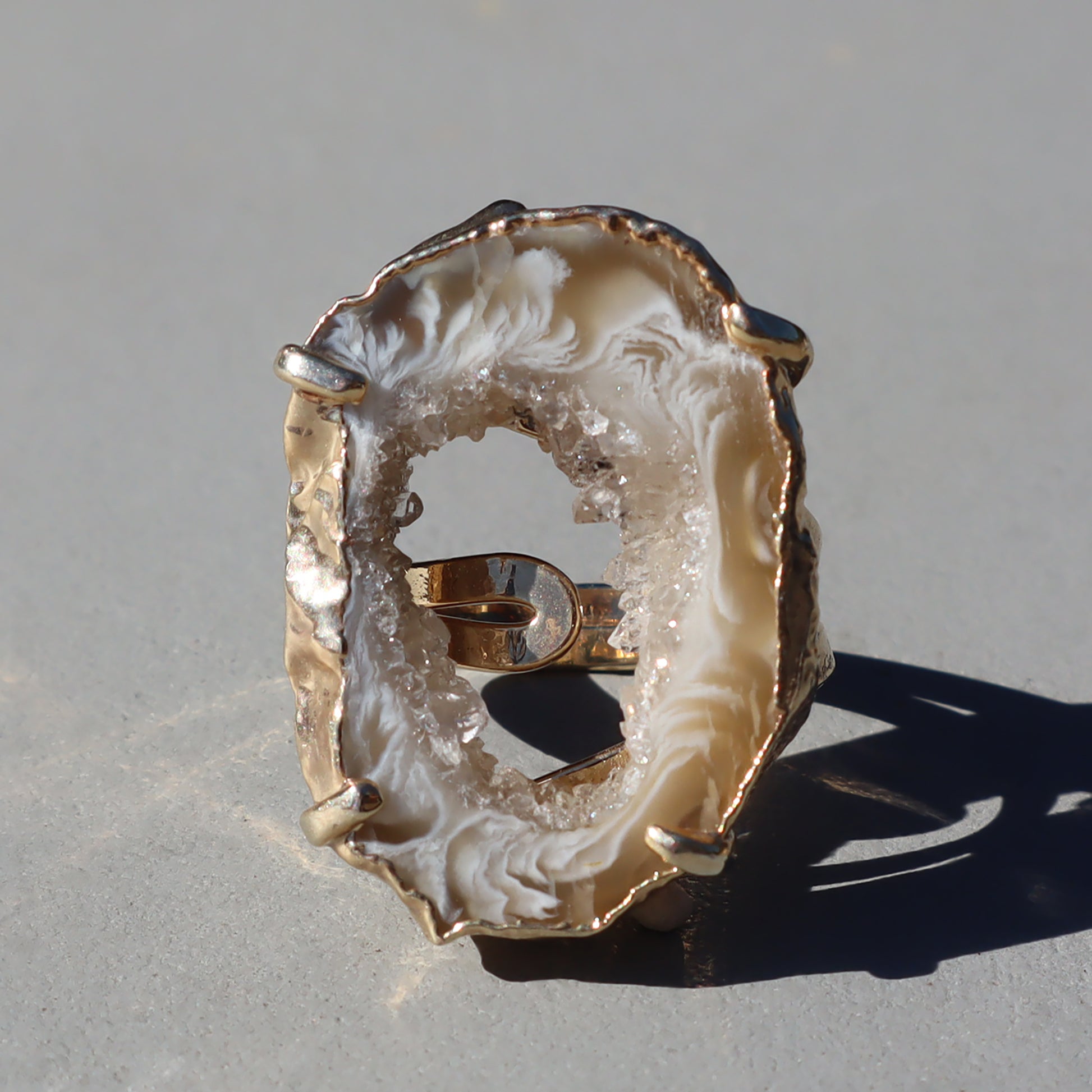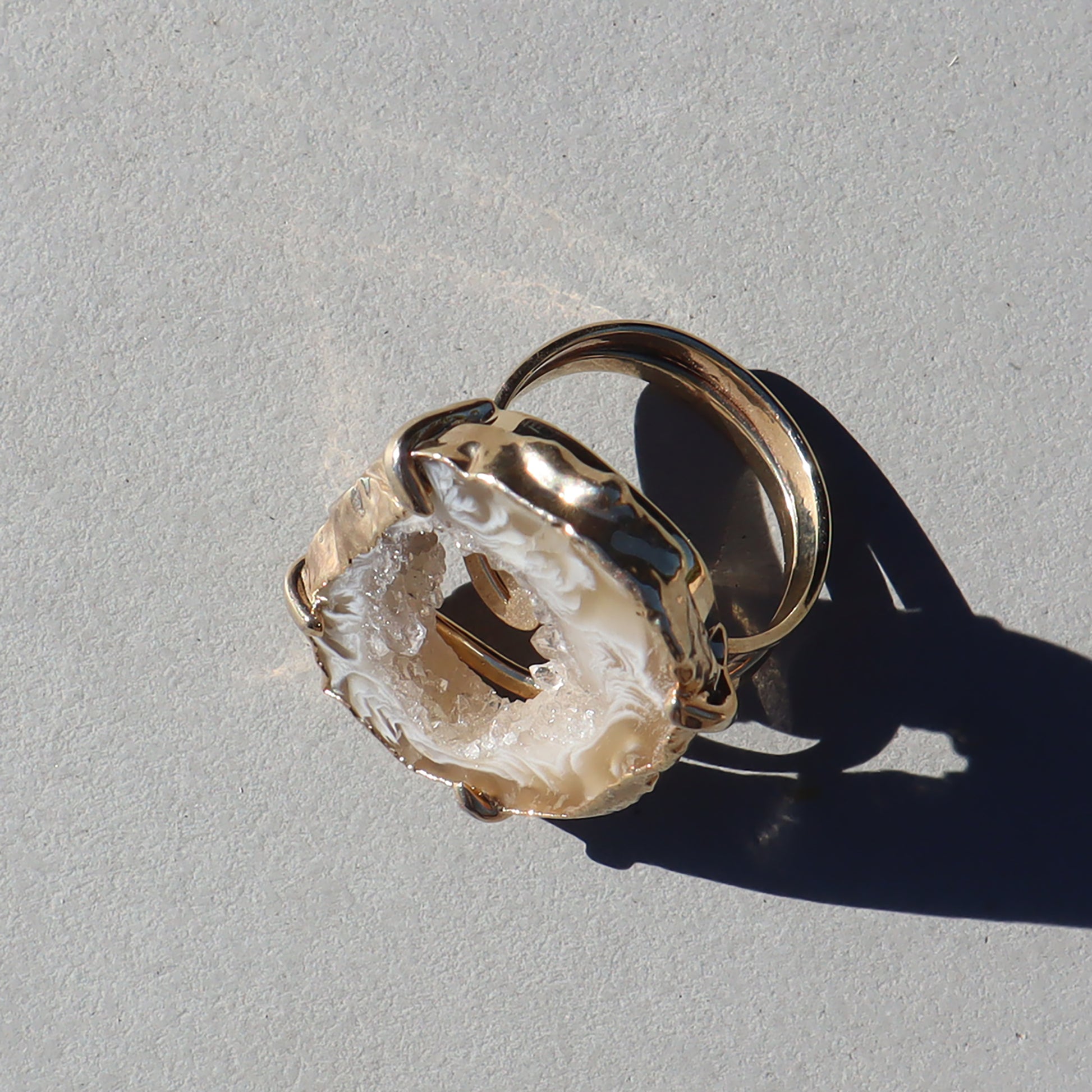 The handcrafted beauty of light agate and druzy crystal ring connects sophistication with raw beauty. Nestled alongside the agate is a sparkling formation of light-reflecting microcrystals that add a touch of celestial magic to the piece.