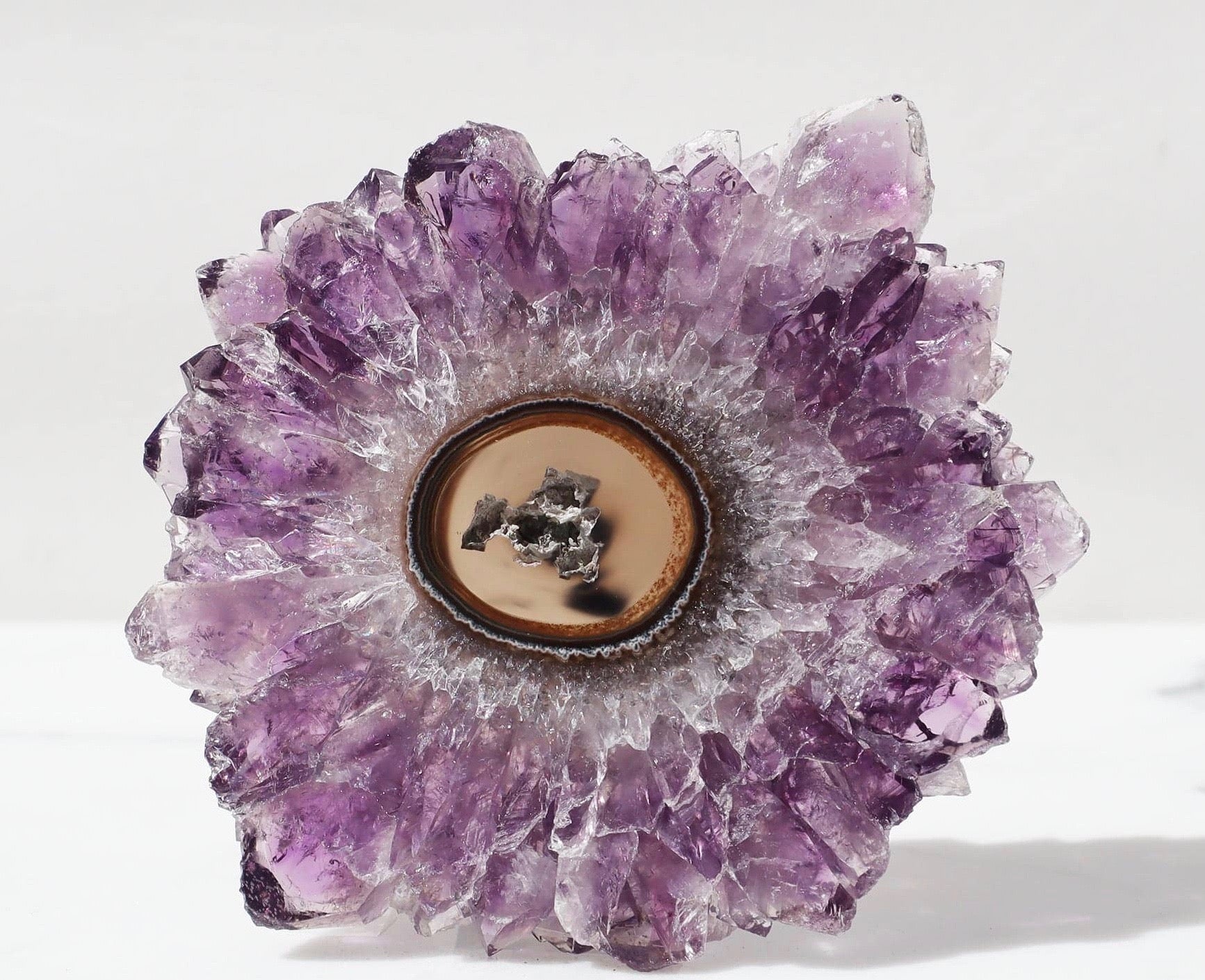 A stalactite forms gradually over time from mineral-enriched water that drips from underground cave ceilings. As the water laden with minerals drips and filters, it leaves behind thin layers of calcite in a repeating process. This repetition results in the creation of multiple rings, giving birth to the exquisite formations known as stalactites. Among these formations are the rare and captivating amethyst stalactites, which develop in and around a central piece of agate. To unveil the amethyst crystals that encircle the central piece, these stalactites must undergo a careful cross-cutting process. The outcome resembles a crystalline "flower" or "eye," showcasing an array of shapes and colors, including breathtaking shades of purple and other alluring colors depending on the minerals involved in their formation.
