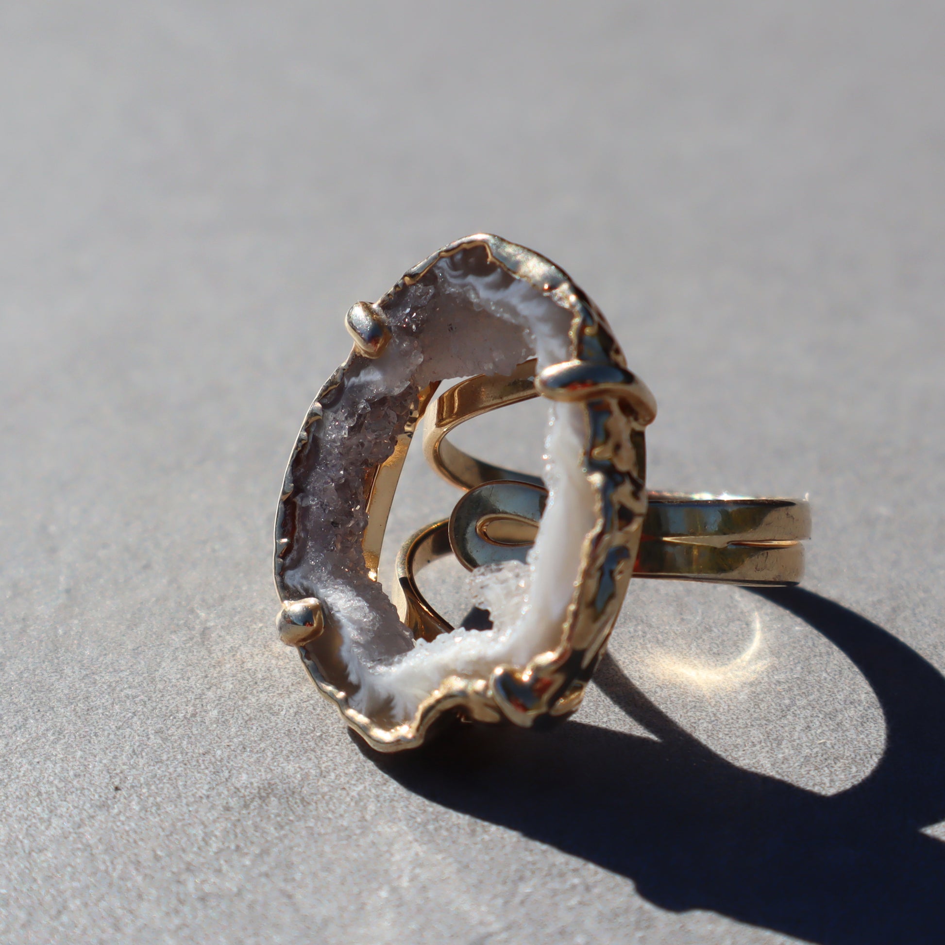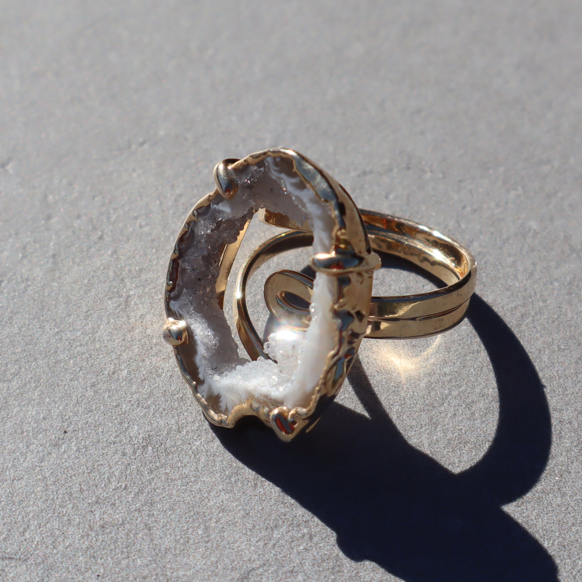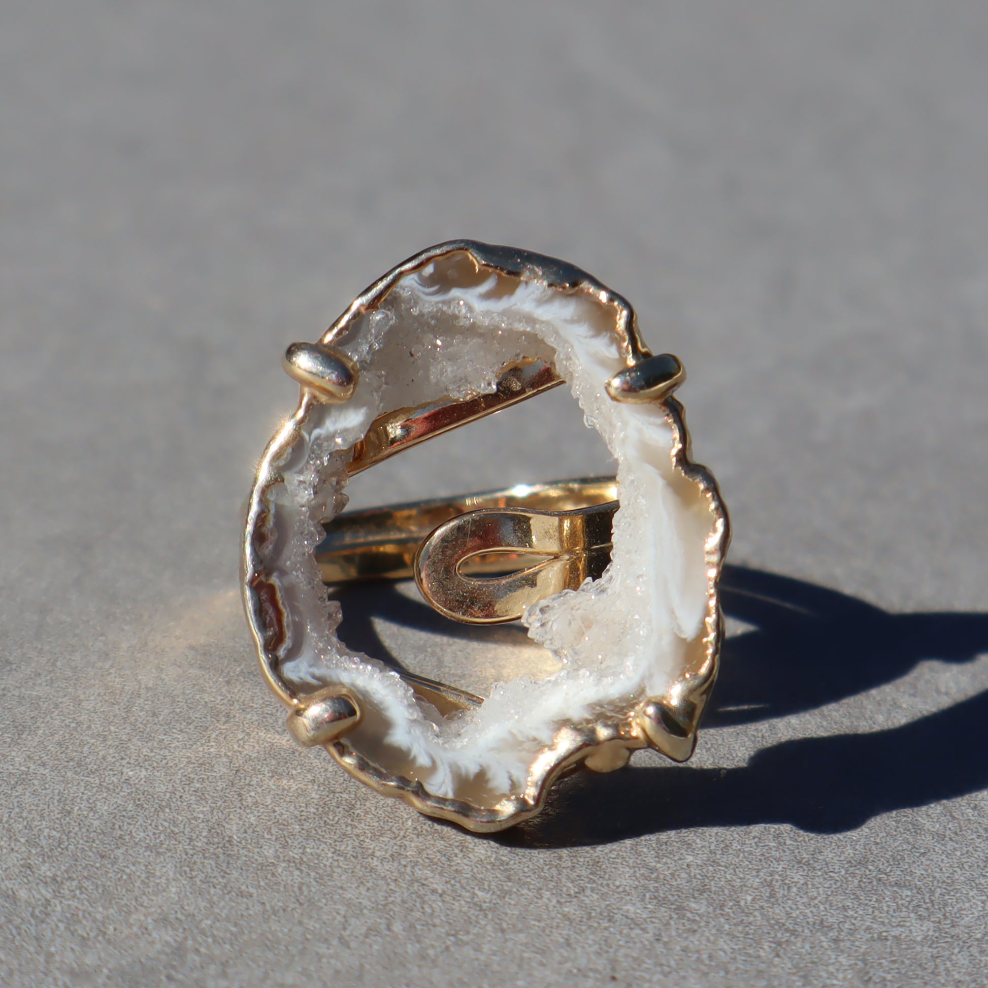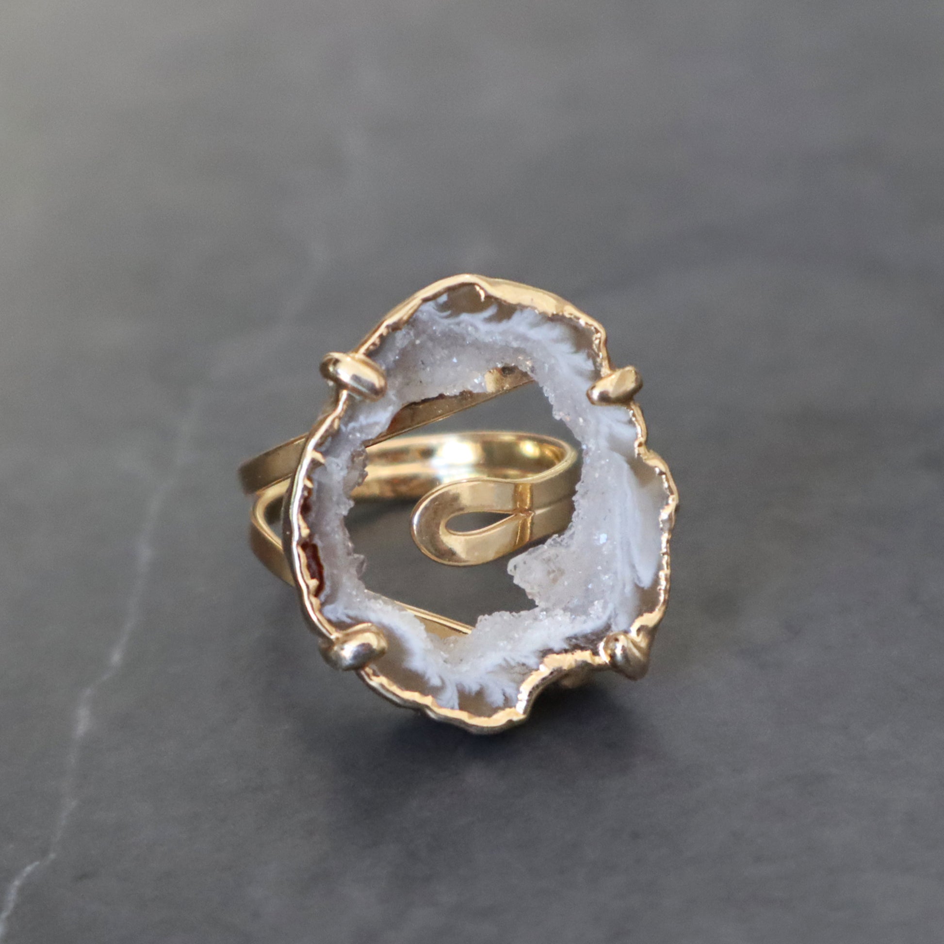 This is a lovely geode slice ring showcases a stunning piece of skillfully polished face agate. The unique hollow center reveals a border of sparkling druzy crystals, glimmering with an ethereal light-reflecting radiance.