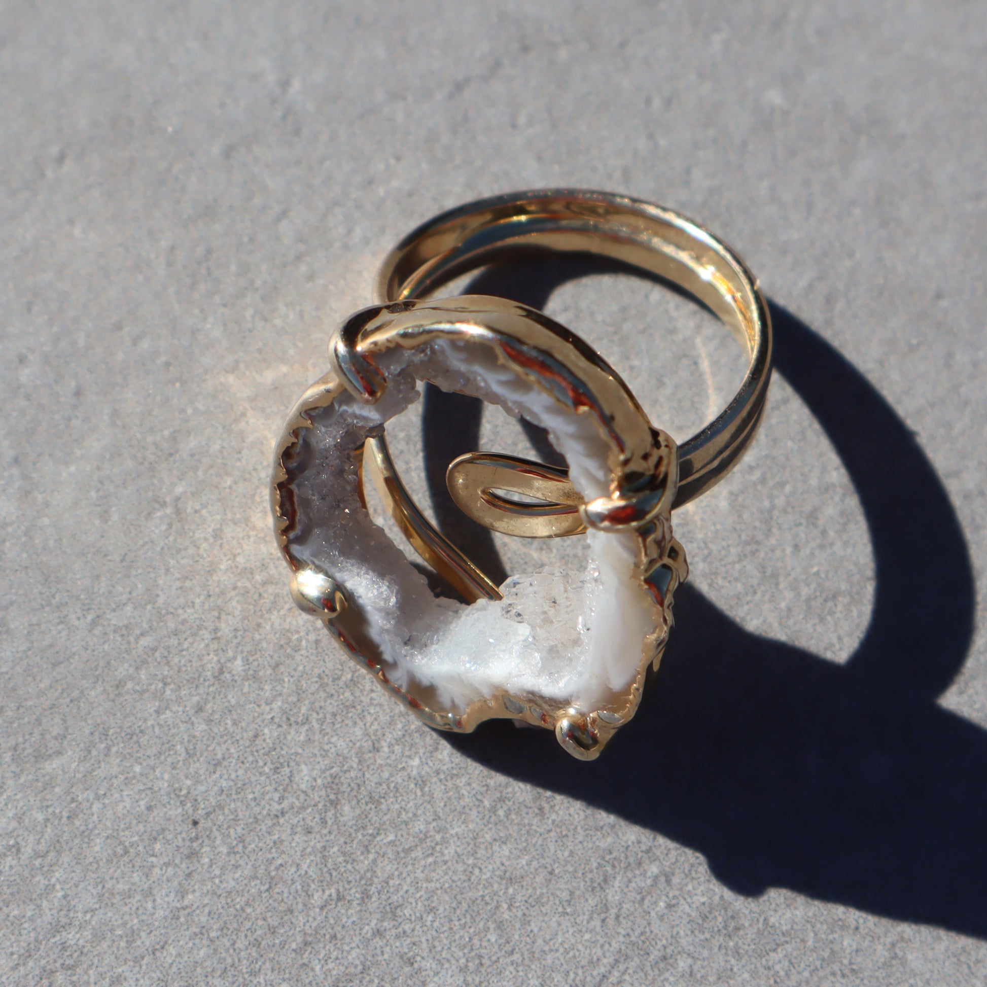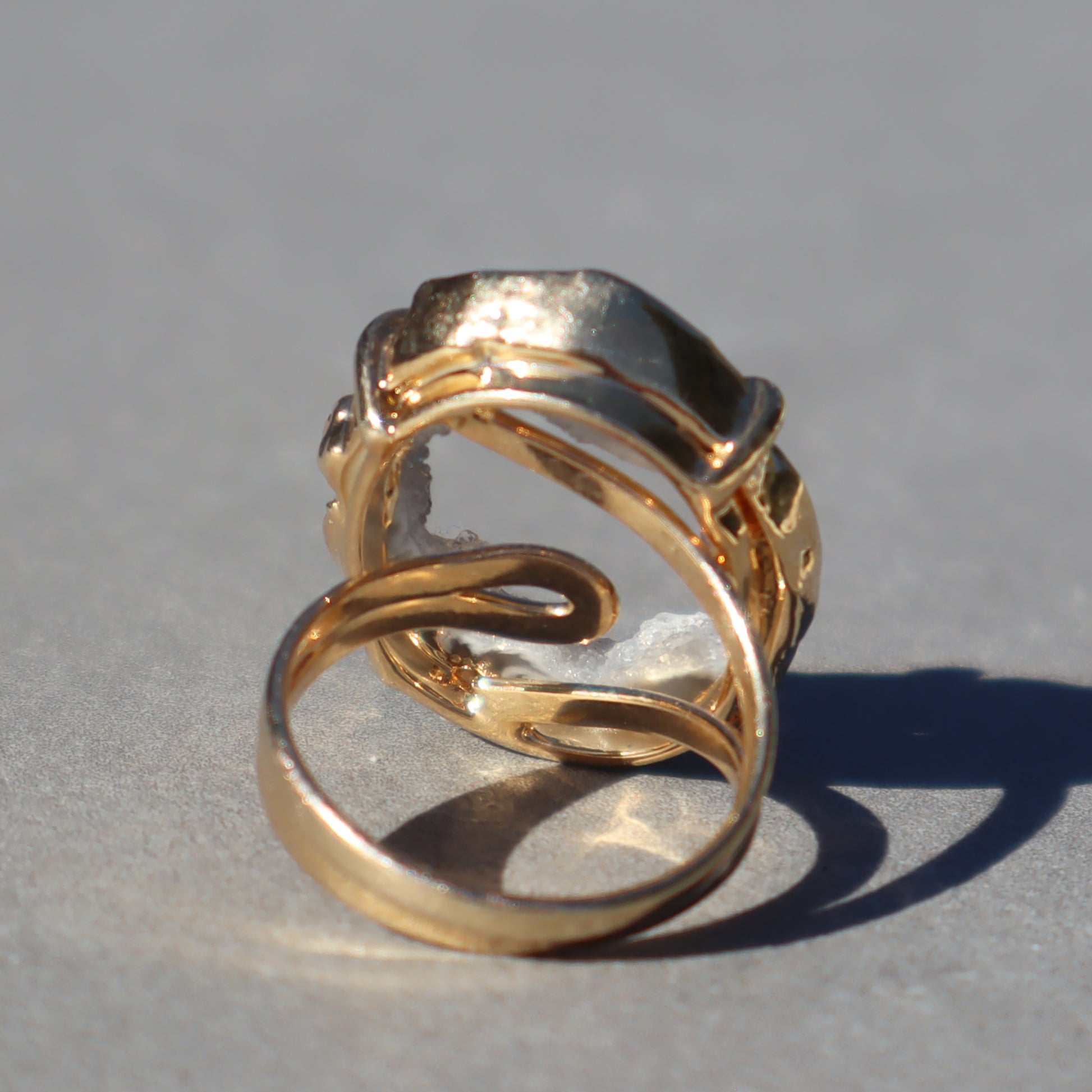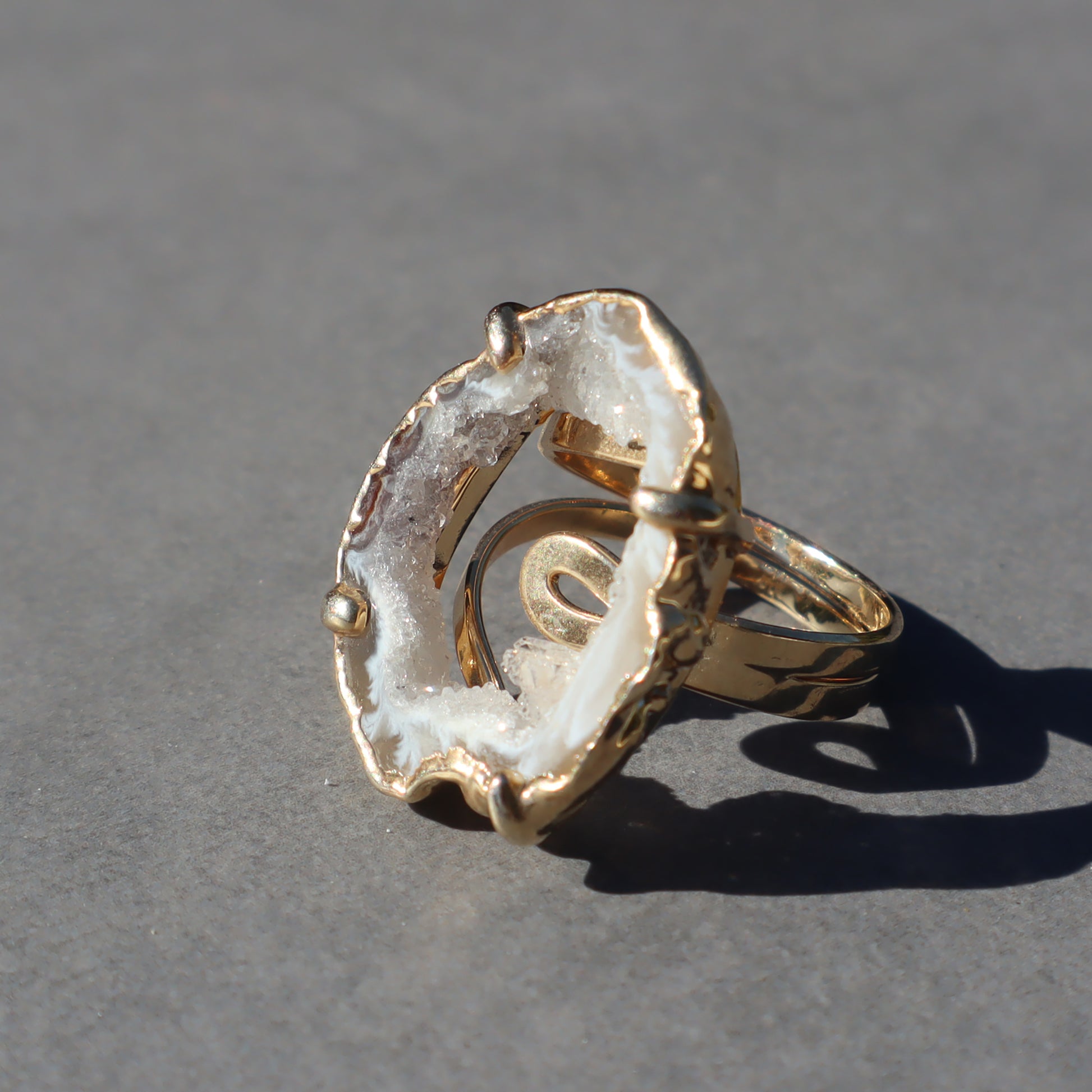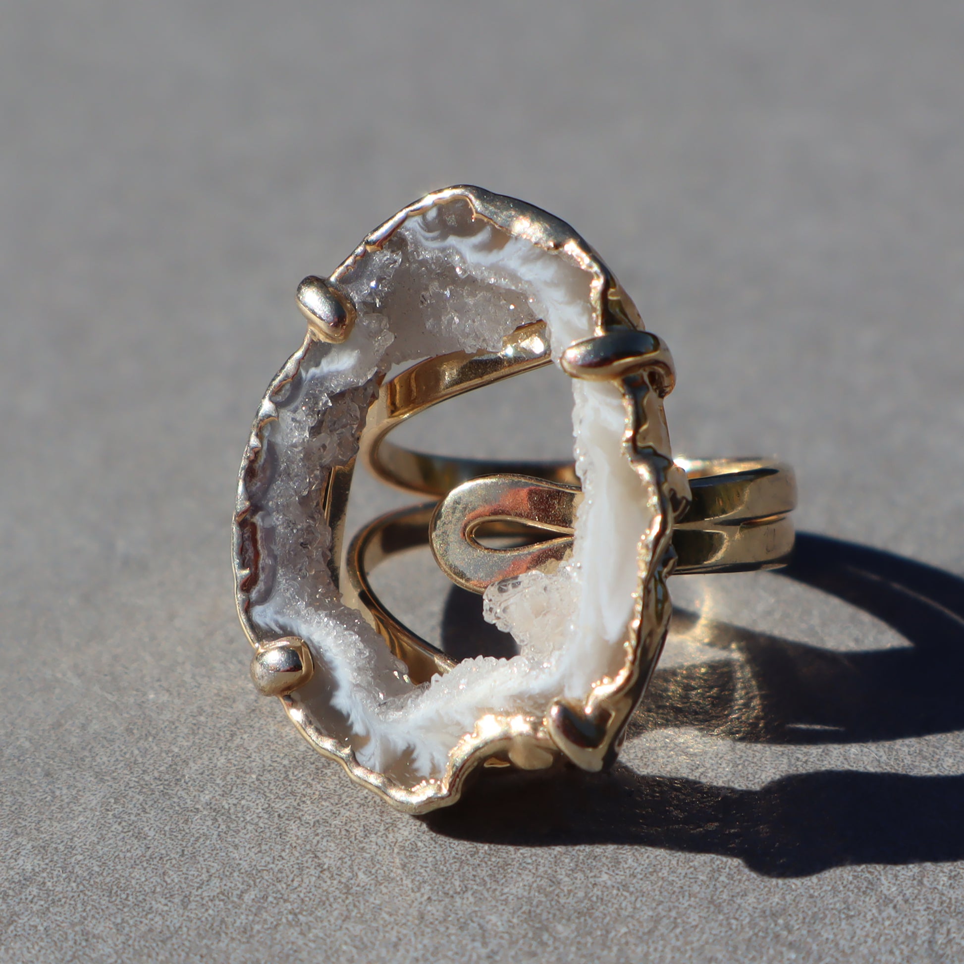 This is a lovely geode slice ring showcases a stunning piece of skillfully polished face agate. The unique hollow center reveals a border of sparkling druzy crystals, glimmering with an ethereal light-reflecting radiance.