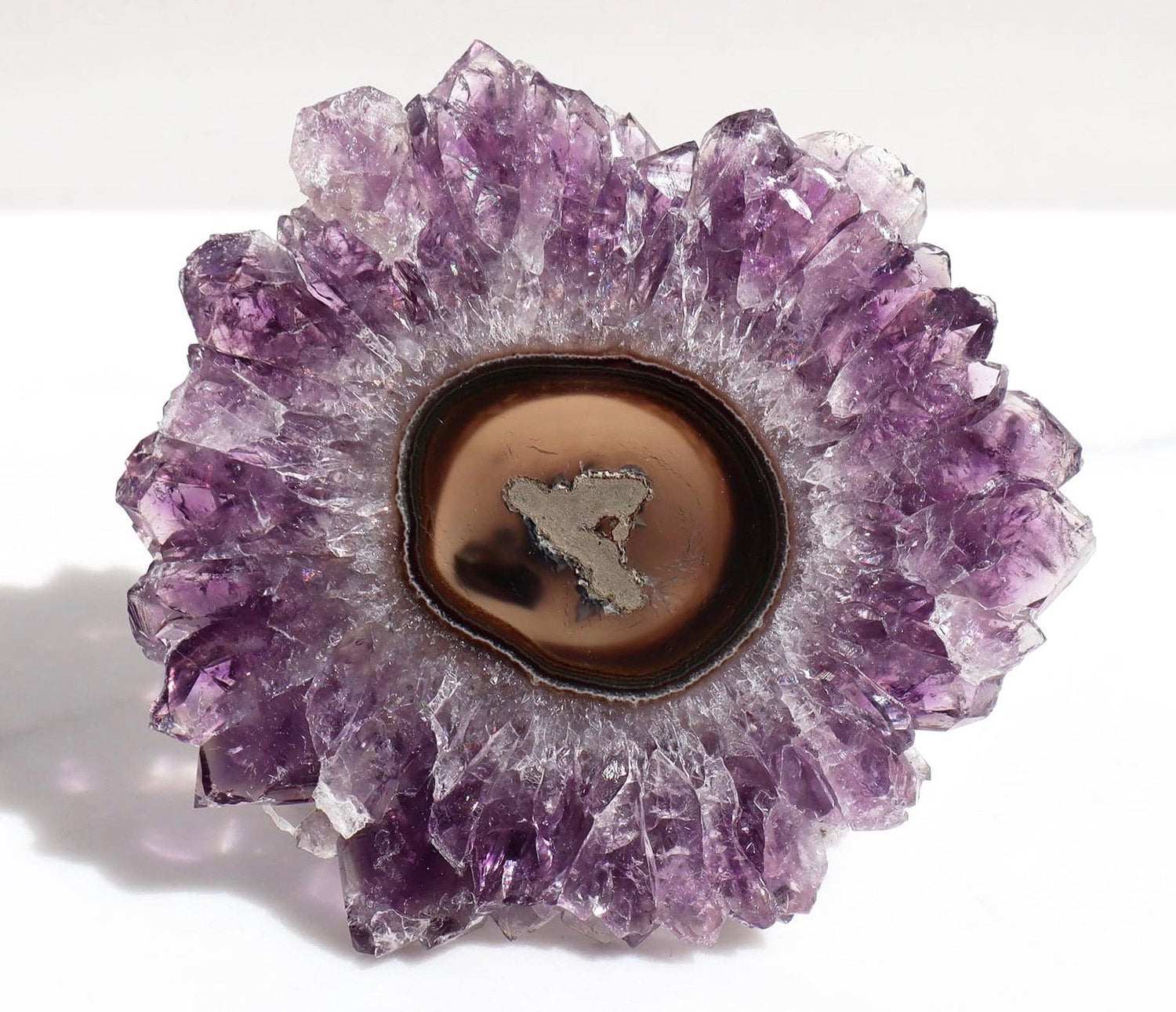 A stalactite forms gradually over time from mineral-enriched water that drips from underground cave ceilings. As the water laden with minerals drips and filters, it leaves behind thin layers of calcite in a repeating process. This repetition results in the creation of multiple rings, giving birth to the exquisite formations known as stalactites. Among these formations are the rare and captivating amethyst stalactites, which develop in and around a central piece of agate. To unveil the amethyst crystals that encircle the central piece, these stalactites must undergo a careful cross-cutting process. The outcome resembles a crystalline "flower" or "eye," showcasing an array of shapes and colors, including breathtaking shades of purple and other alluring colors depending on the minerals involved in their formation.